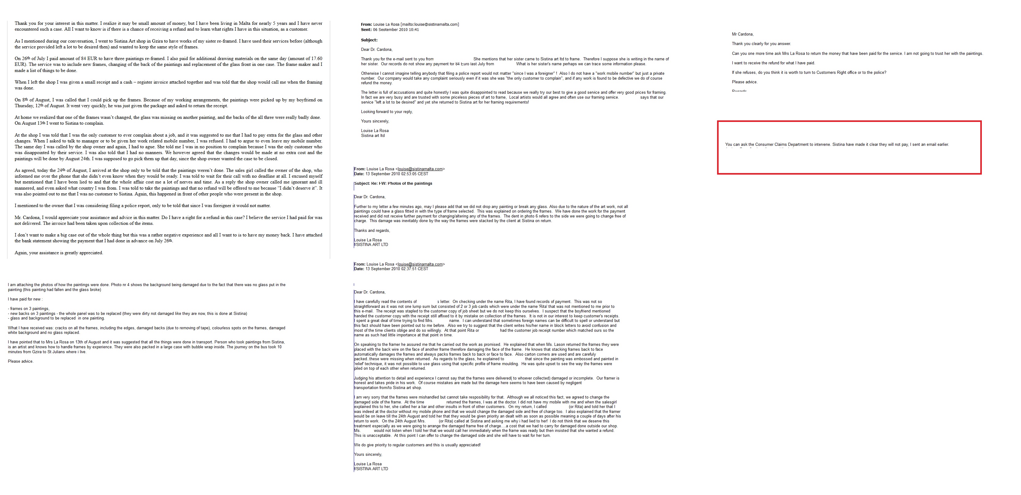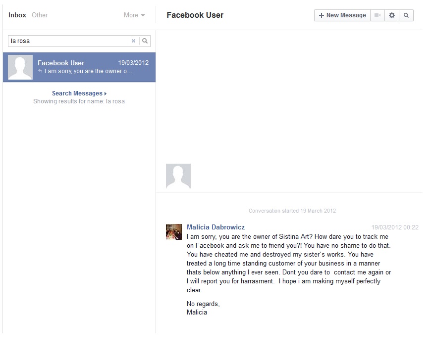 I want to do something right now. Some things were not posted on the original blog but we will post them now. Just to show you dear readers that we are not lying or accusing Sistina Art. Back in 2010 we have tried every possible route to receive our money back. In case you don’t remember – we were told by Louise La Rosa that we didn’t deserve a refund, she also made enquiries about us being foreigners and our nationality. There is a name for it: racism.