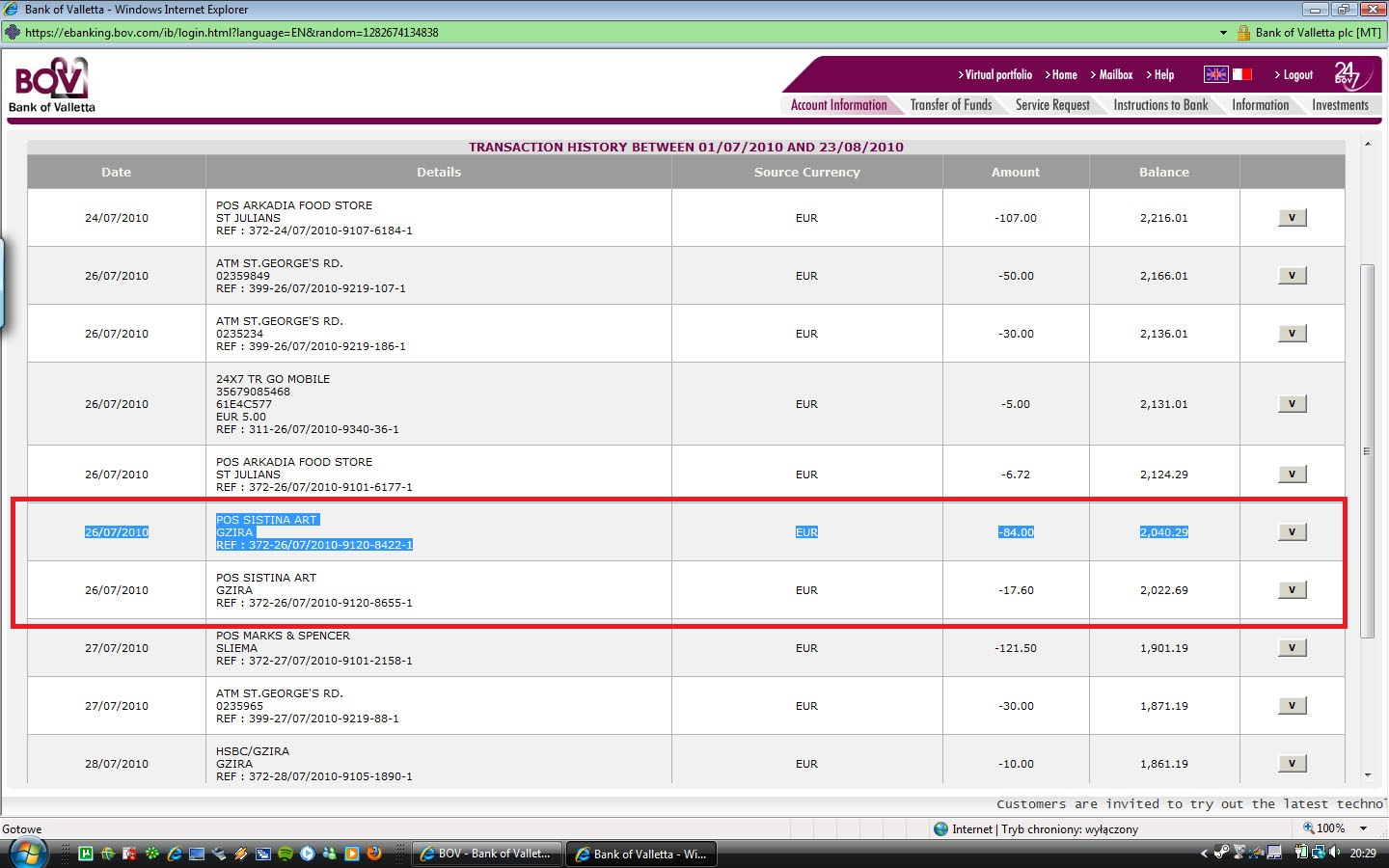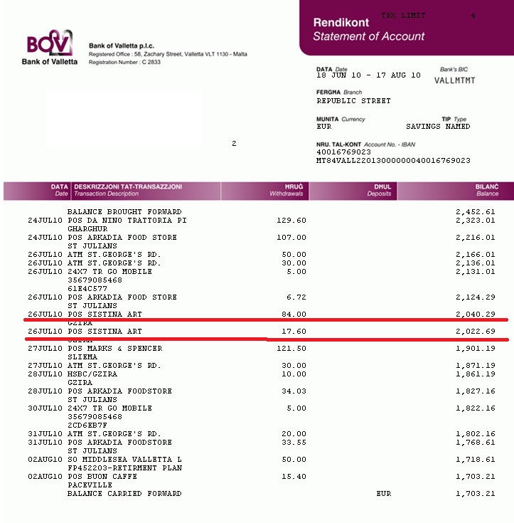 Originally we paid 84 EUR for frames and 17 EUR for additional materials (passpartou/background). These are the screenshots from my old Bank of Valletta account with the reference numbers visible for each transaction. This is very important.