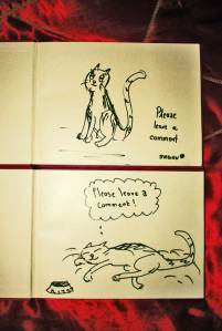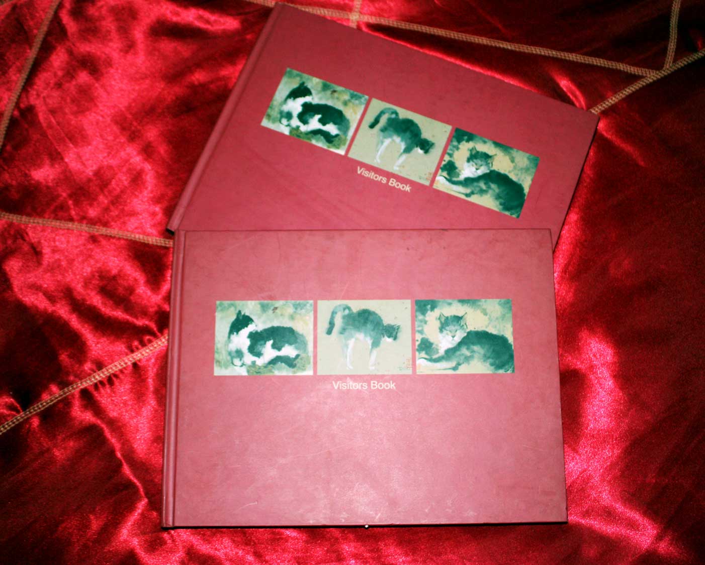 Now we want to draw your attention to our guest books. We have two lovely books with cat patterns on the cover and some lovely cartoons inside. If you haven’t been introduced yet, this is Sammi, Mal`s cat. She is very curious and loves to inspect things. We thought it would be appropriate to put her into the guest books. Cartoons are done by Marco Attard.