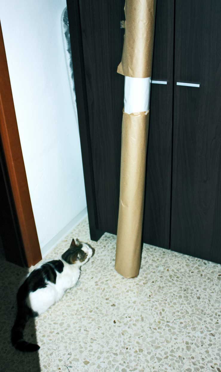 And since we speak about Sammi, here she is checking on a roll of plastic. This will be cut into pieces to make “raincoats” for the paintings in case of rain. What you are seeing is 10 meters of transparent 5 mm plastic ready to be used.