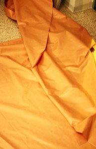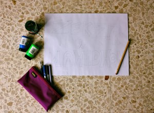 The evening of 24th of September was spent on closing all the lose ends in preparations. We have cut the fabric (try to run though 50 meters of fabric in two colours and cut it in equal parts, not easy!), made hooks on which the paintings would hang and prepared the poster. Letters were first drawn on the paper, coloured with luminous acrylics, then cut off and glued onto a new sheet.
