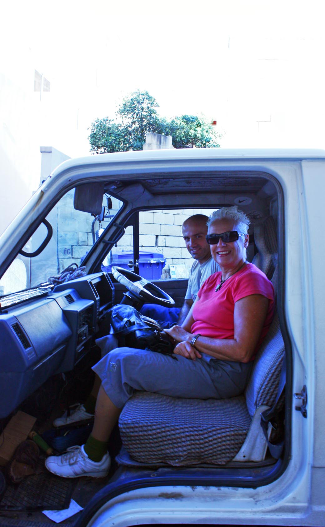 All the works were transported on a truck driven by Pauleen`s neighbour Mario. He proved to be careful and experienced driver. He not only managed to deliver all works without a scratch (and took them back afterwards as well), but stormed his way into Valletta centre that was occupied by morning market. For the sake of the records, we place a photo of Pauleen and Mario in the truck, moments before hitting the road.