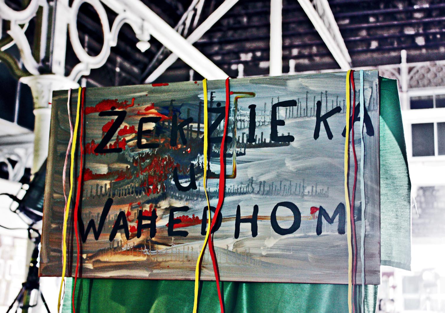 We have decided with Pauleen that since we couldn’t exhibit in the streets, we were to organize our own `market` inside the building. Doors of closed establishments were covered with material and provided exhibition space while the walls between occupied shops were used to hang smaller items.