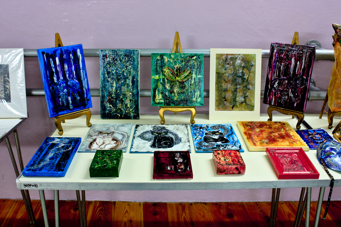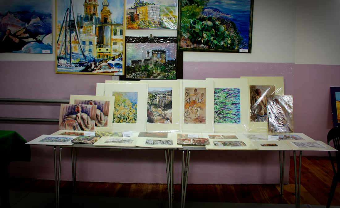 Once at Pauleen`s studio we arraned very quickly. In two hours all the studio have been turned in a lovely art gallery. Each artist has two tables. Our stand lookd like this and is near the entrance:
