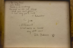 In 2009 Rita made a painting which she entitled Altamonte. Its named after a place where Chuck resided. It is said to be really beautiful, full of bright colours. So is the painting. She had put a quote on it and dedicated it to Chuck`s mom Jane who does a hell of a great job protecting and representing her son`s work. I always tell her its a beautiful piece and once suggested to send it to Jane, but Rita is afraid that Jane perhaps wouldn`t like it.