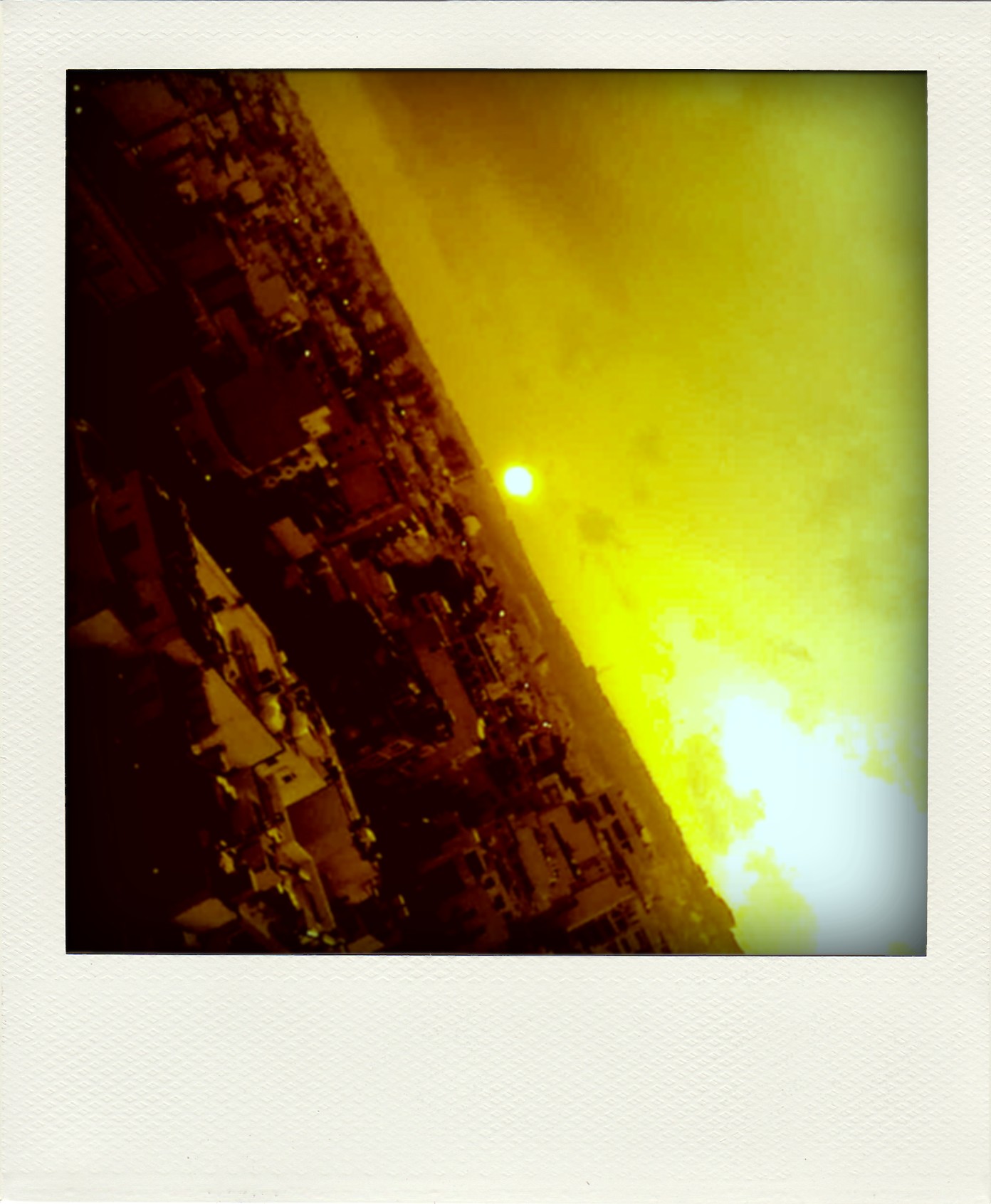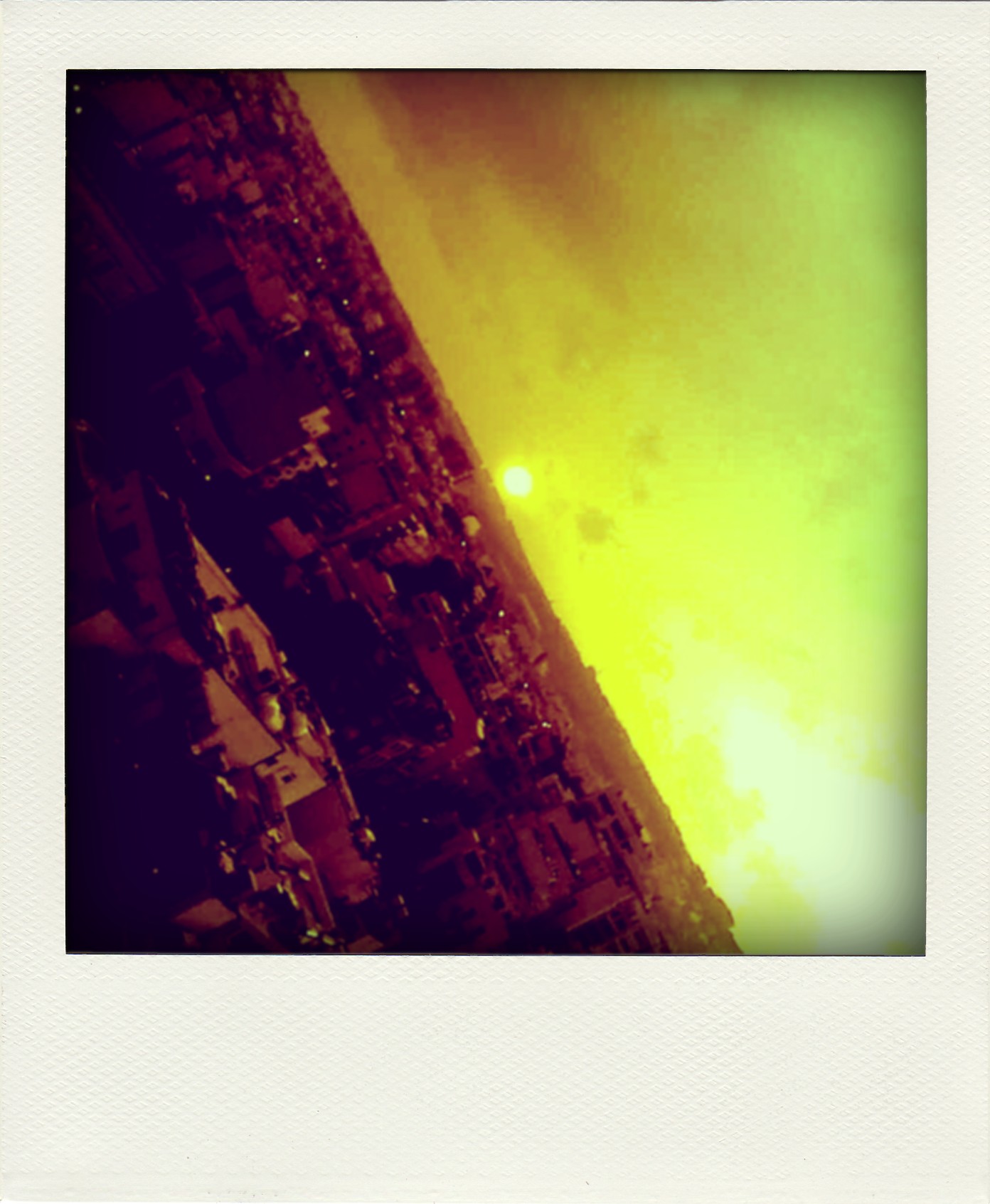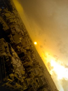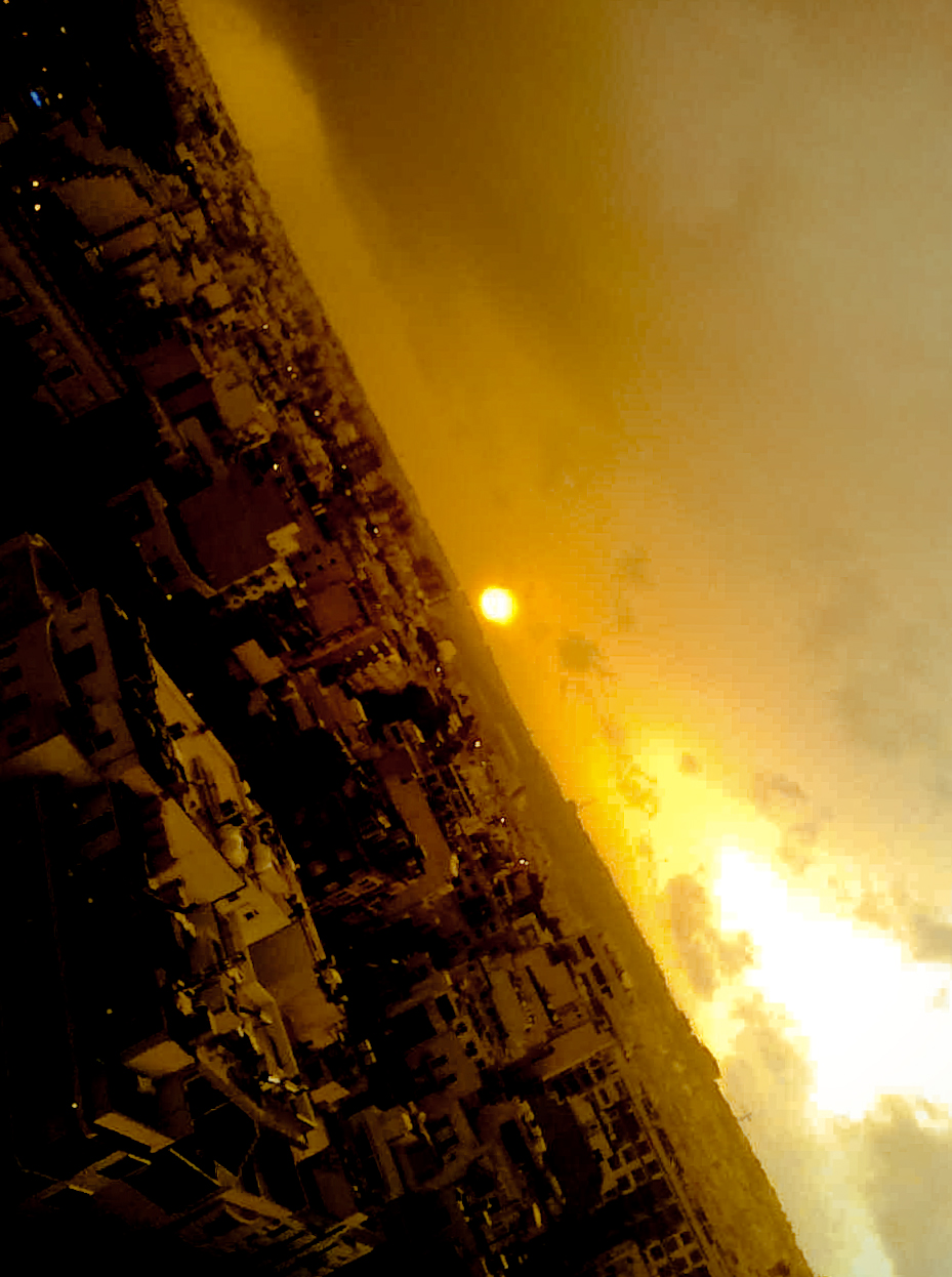 As we have mentioned before, the sunset was “nearly” apocalyptic. So we wanted to keep the feel of it. We had a bit of discussion what the photo could present before we actually started editing. We thought it looked like somebody was falling from a tall building or was looking from a high point onto the area below. Then there were the pixels. Rita suggested it was like a motion capture from a CCTV cameras. And then we had it.