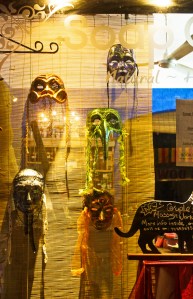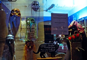 A while ago, Rita produced masks made from pape mache and hand painted them. We thought it would be a great idea to display them in the window at Soap Cafe, creating an unique exposition just in time for Carnival. Charlene agreed and last week we meet up at the shop to bring some Mardi Gras spirit to Malta. It took about 2 hours to position the masks and to create the display.