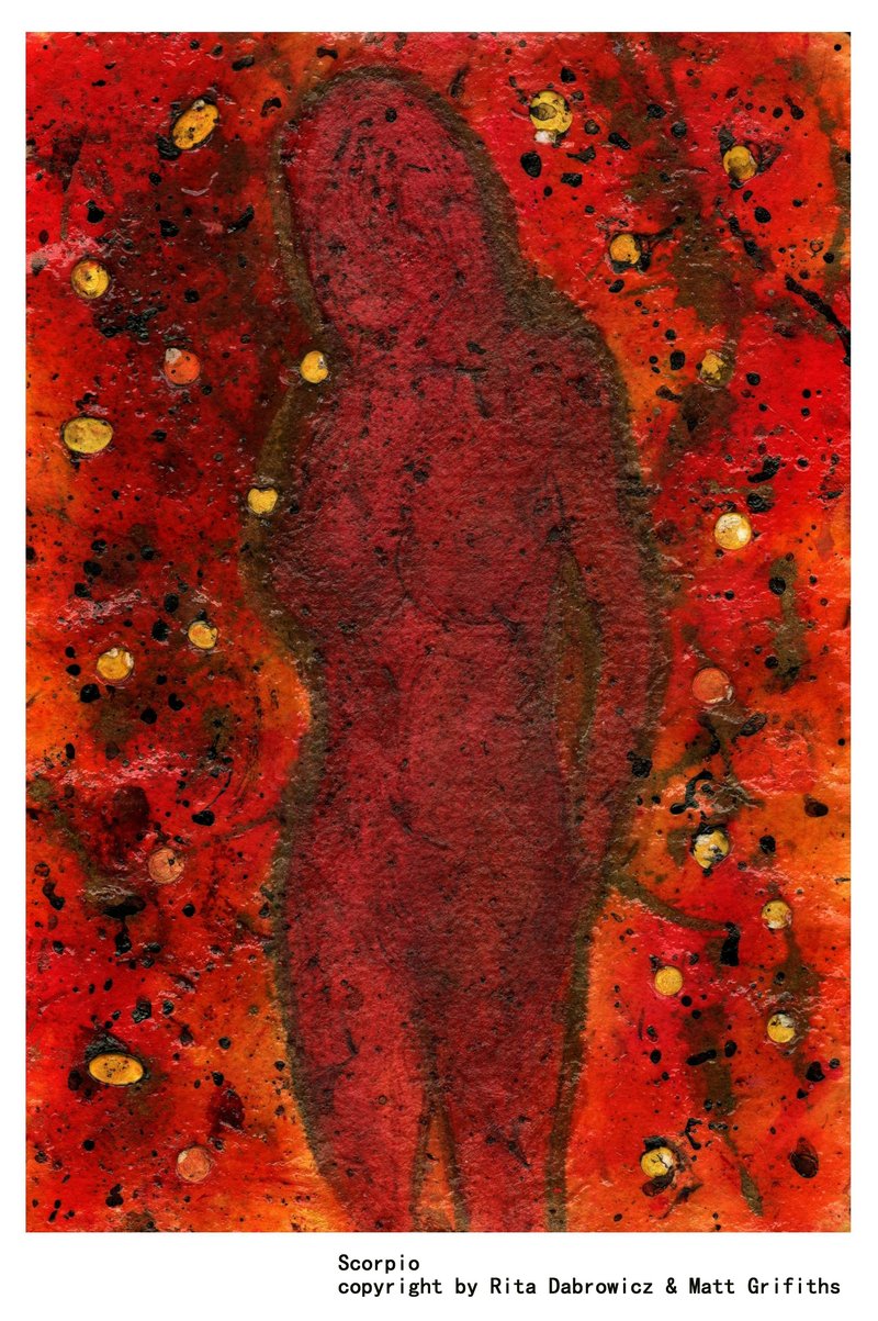 Matt: Scorpio is unique to me for several reasons. First, the sketch that was used to create this artwork has been drawn under similar circumstances like Aquarius – on a sunny Sunday afternoon. It was perfect from the very beginning – there was no need to fix or change anything. The thick, golden lines around the figure symbolize a barrier that cannot be easily passed. The lady seems to be protected by an aura of power – or by the fire that burns from within.