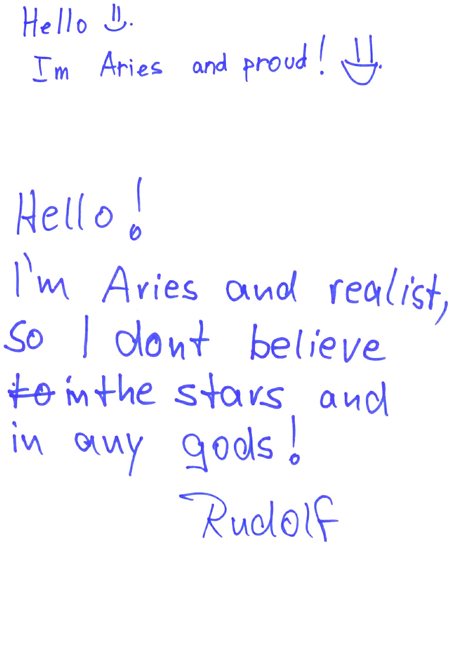 The second page of the guest book was shared by two different authors. The first one, also anonymous, wrote: “Hello! I’m Aries and proud : D ”. The second comment came from a man named Rudolf. With typical Arian sarcastic sense of humor, Rudolf stated: “Hello! I’m Aries and realist, so I don’t believe in the stars and in any gods”. Too bad Rudolf! Joseph Ratzinger aka Pope Benedict XVI is also an Aries and a very religious man!