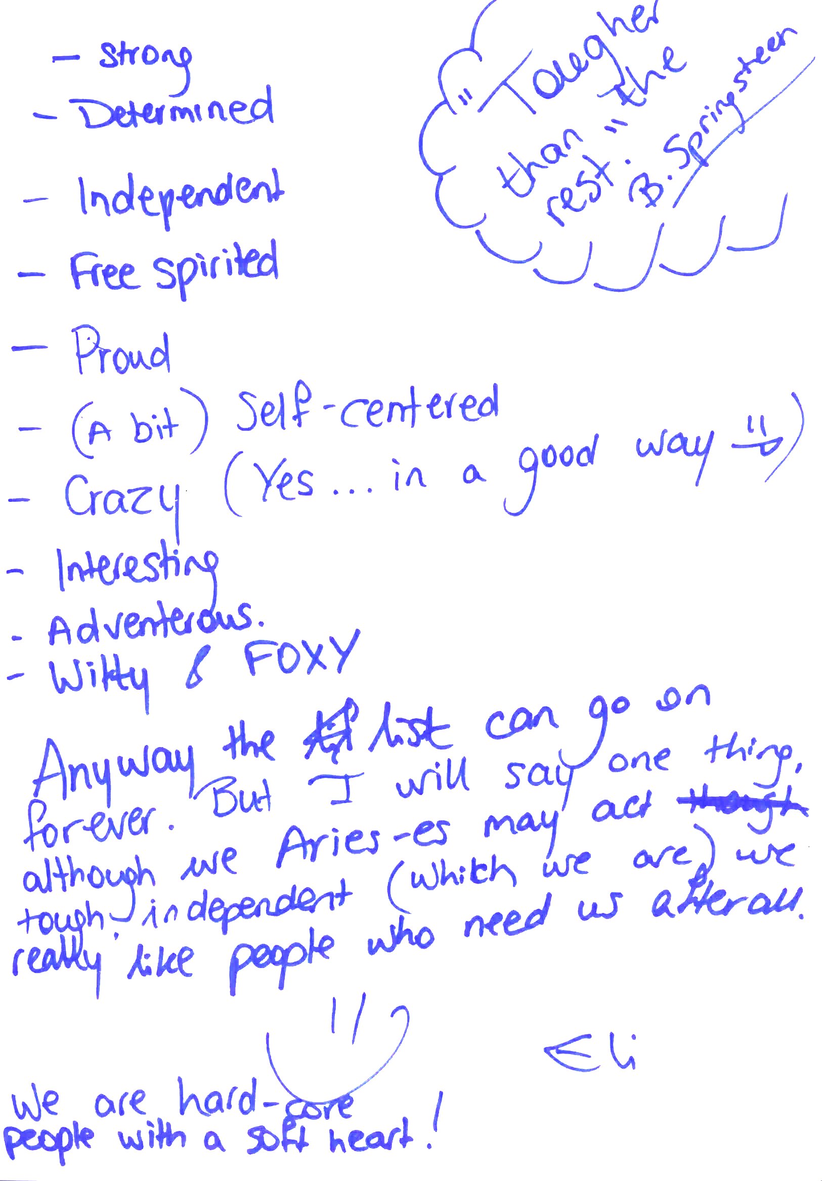 The next entry, left by a person named Eli (we cannot determinate if it’s her or him) is the longest comment we have ever received. Eli starts with quoting a well chosen song “Tougher than the rest” by Bruce Springsteen and then gives us a long list of the best traits in Aries: “Strong, determined, independent, free spirited, proud, (a bit), self centered, crazy (yes…in a good way :P), interesting, adventurous, witty & foxy. Anyway, the list can go on forever. But I will say one thing. Although we Aries-es may act tough, independent (which we are), we really like people who need us after all”. Eli then ends with: “We are hard-core people with soft hearts!”. We don’t know if Eli is aware that one of Bruce Springsteen’s closest friends and collaborators, Max Weinberg, the drummer for The E-street Band, was born on April 13th. That makes him an Aries too!