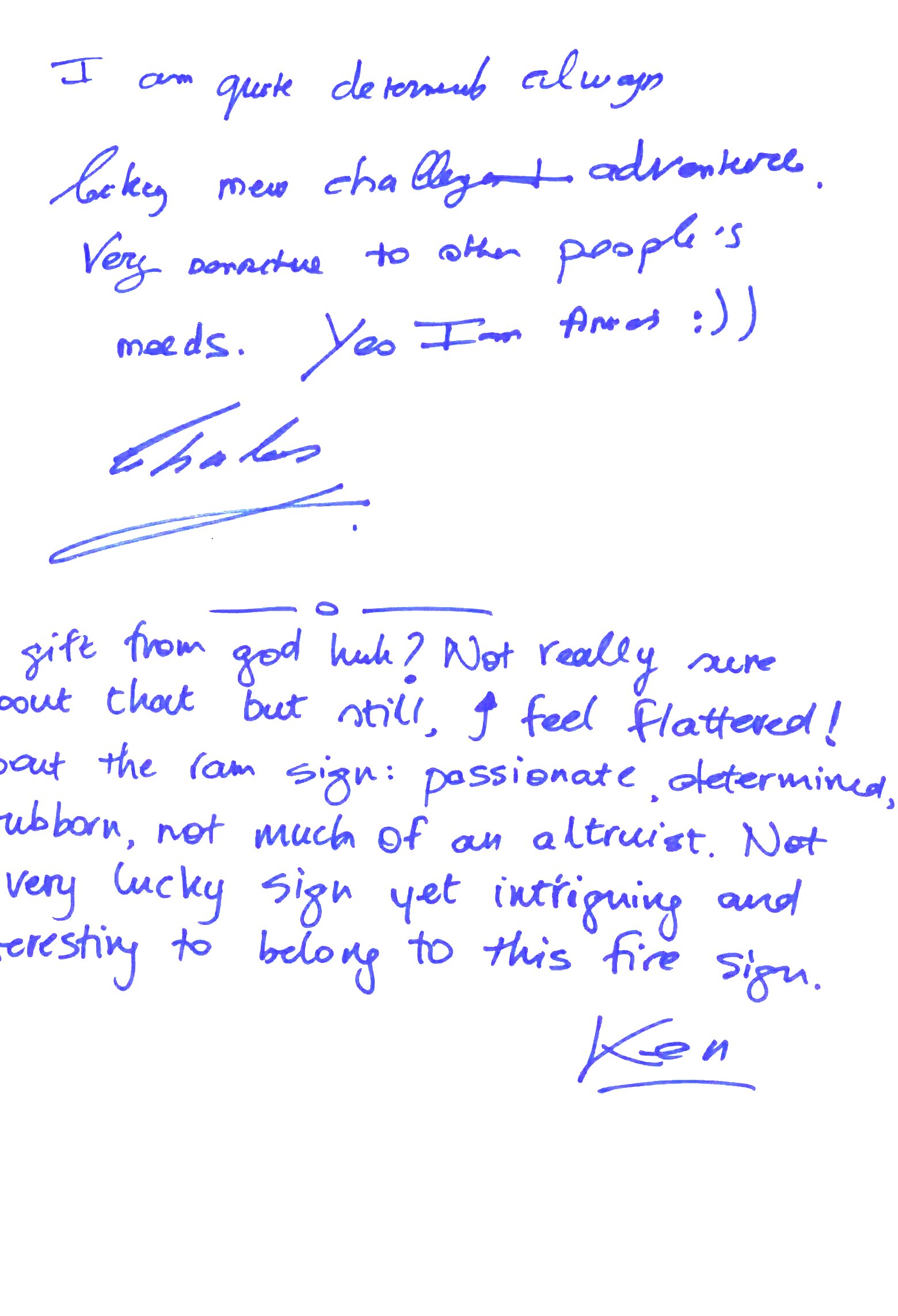 Charles and Ken, our next visitors, shared the page and two personal tales. Ken posted a response to Pauline’s entry with: “A gift from God huh? Not really sure about that, but still I’m flattered! About the Ram sign: passionate, determined, stubborn (and) not much of an altruist. Not very lucky sign yet intriguing and it’s interesting to belong to this fire sign”. Charles wrote: “I’m quite determined, always looking for challenging adventures. Very supportive of other people’s needs. Yes, I’m Aries”.