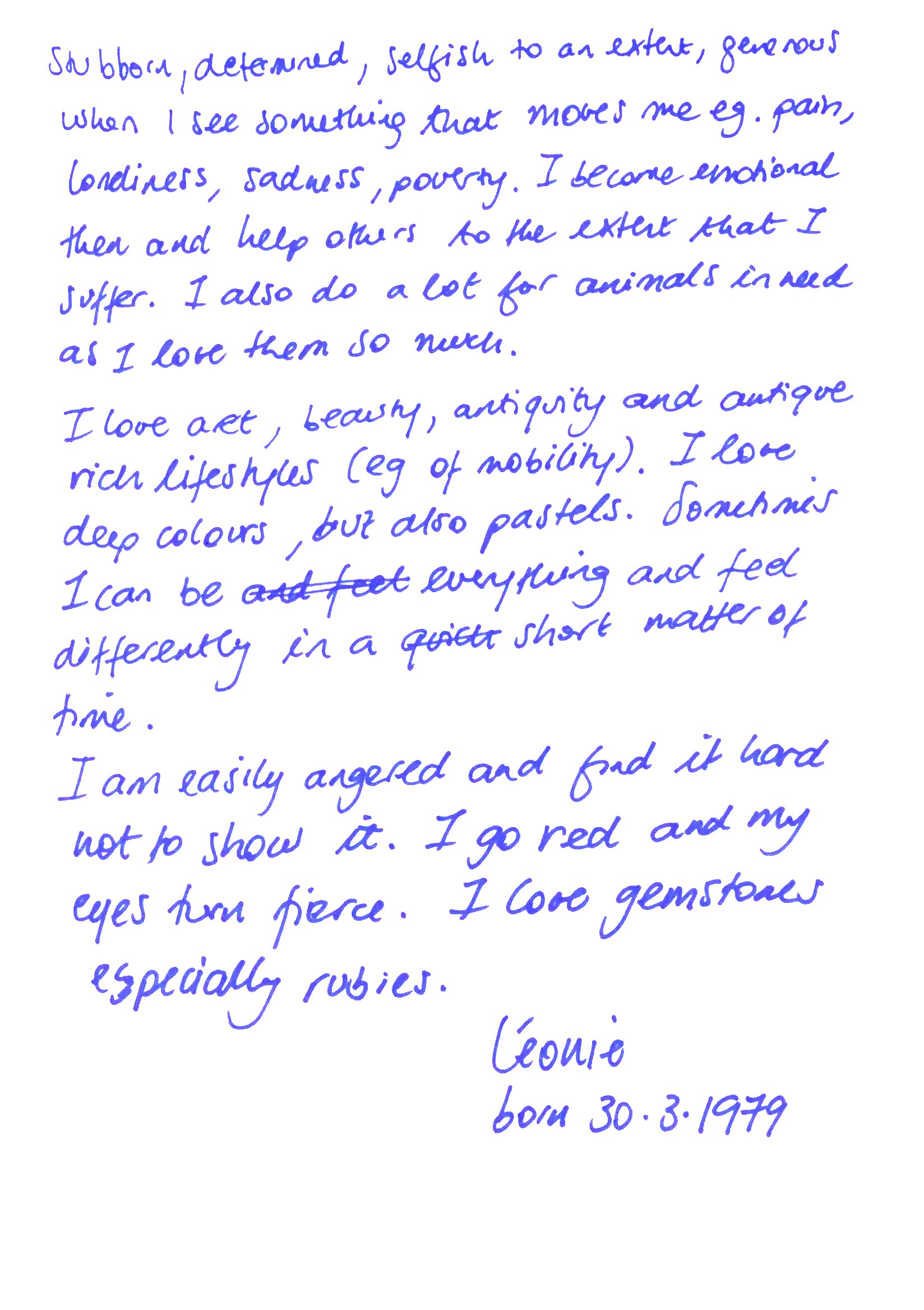 Like Kevin and Charles, Léonie (born on 30th of March 1979) shared rather personal outlook on being Aries: “Stubborn, determined, selfish to an extent, generous when I see something that moves me (for example) pain loneliness, sadness, poverty. I become emotional then and help others to extend that I suffer. I also do a lot of animals in need as I love them so much. I love art, beauty, Antiquity and antique, rich lifestyles (for example of nobility). I love deep colors but also pastels. I can be everything and feel differently in short matter of time. I am easily angered and find it hard not to show it. I go red and my eyes turn fierce. I love gemstones, especially rubies”. Léonie would be delighted to know that the “official” colors for Aries are deep red, carmine and purple, and the gemstones: ruby and coral! The Aristocrat Aries include King Henry IV, Otto Eduard Leopold von Bismarck and is Cayetana Fitz-James Stuart – the 19th Duchess of Alba.