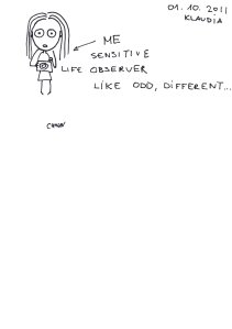 Klaudia, another “Notte Bianca” guest and contributor to this guestbook, left a cute, comical drawing of herself! She wrote: “Me (arrow pointing) Sensitive, Life Observer, like odd, different (things)”. Good news Klaudia! You are not alone! The (in)famous singer turned actress Courtney Love is known to be a fan of everything that’s odd!
