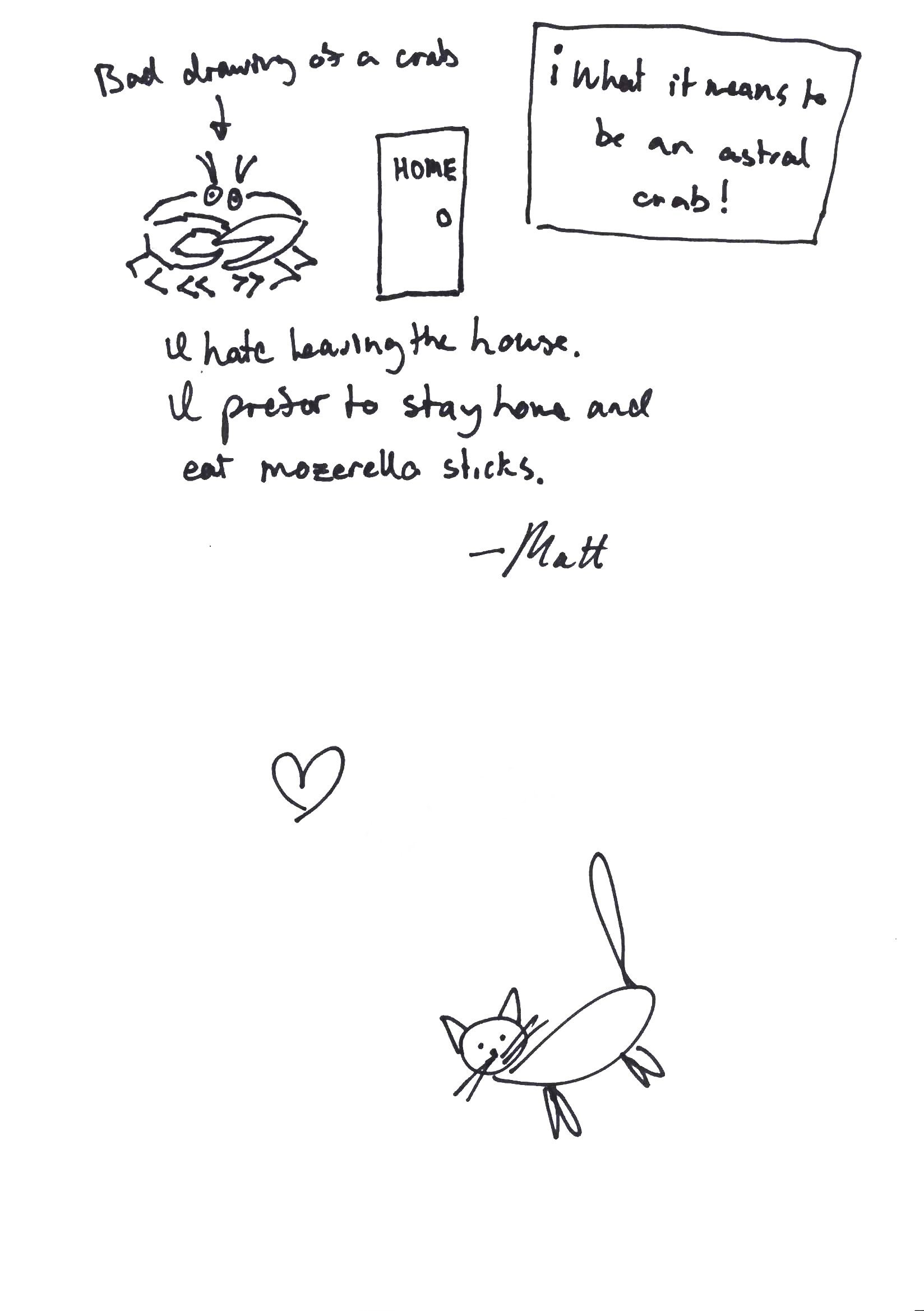 Even more humor can be found in Matt’s comment on another page. Matt wrote: “I hate leaving the house. I prefer to stay home and eat mozzarella sticks”. The entry is accompanied by as described by the author “bad drawing of a crab”. We love the drawing but we are puzzled why somebody else drawn a cat and a heart at the bottom of the page? Maybe to suggest that cats like not only fish but seafood in general? Who knows?