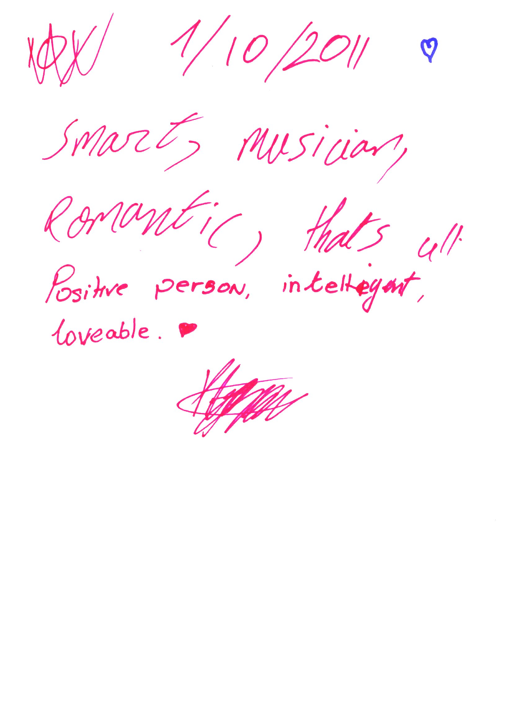 Another guest, Anna has given us a note in German. We translated it to: “Universal, interesting, optimistic, talented, funny, friendly, loves animals especially cats, pursuing their goals and aims, intelligent and many, many more”. She also added: “Open-minded, tolerant with a good heart”. And just to prove her point, Anna has left a drawing of a heart pierced by an arrow!