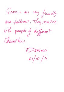 We are back to English again! One page, two authors. The first said: “Smart, musician, romantic, that’s all!”. The second added: “Positive person, intelligent, lovable”. The sentence ends with a heart symbol, just to emphasize how lovely the Twins truly are. We must agree – there are many musicians born under this sign. They are not your average, silly songstresses or pop starlets – they are the bards like Paul McCartney and Bob Dylan.