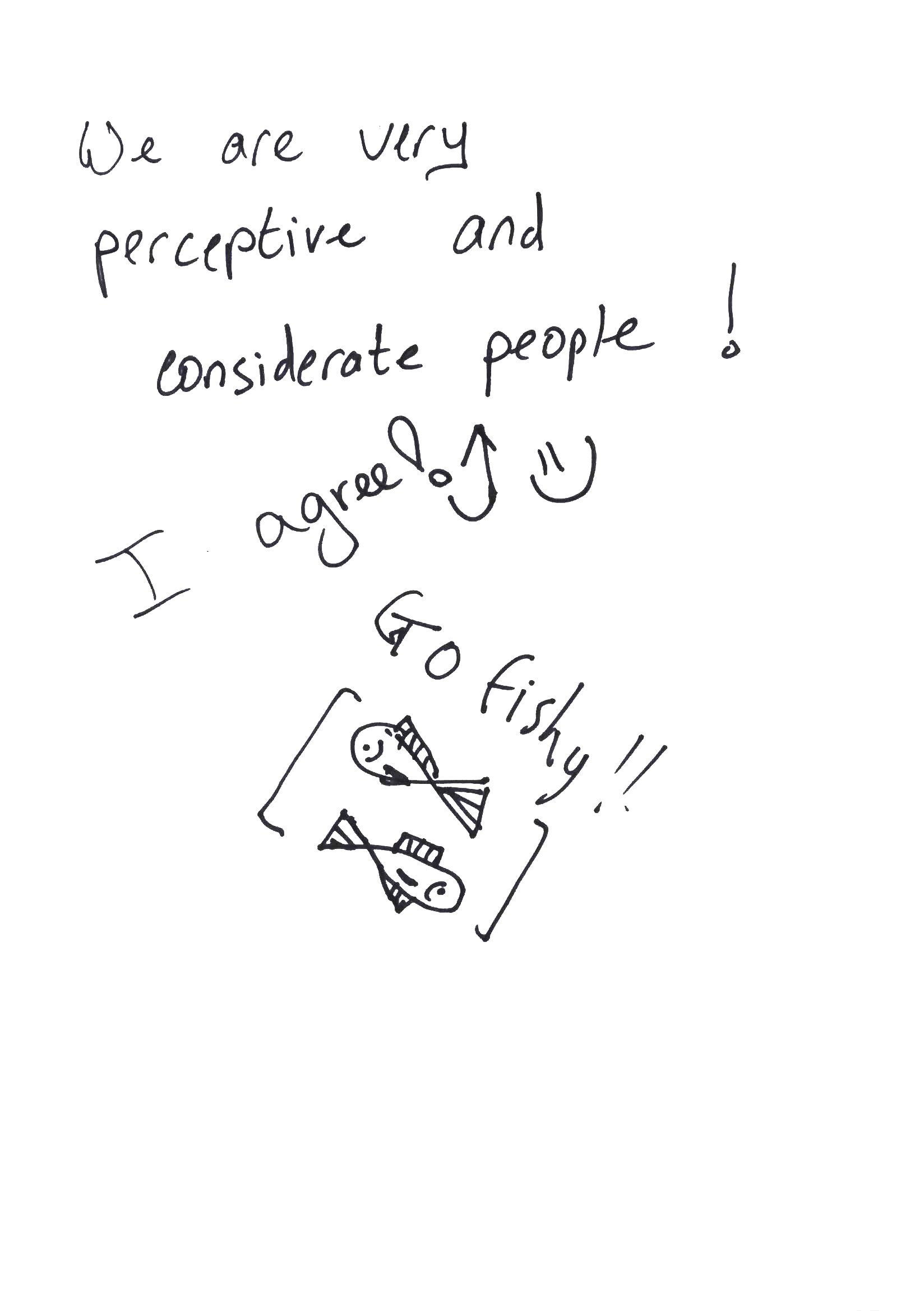 Similar situation is repeated again on the following page: two comments, both anonymous, and authors that are supporting each other’s opinions. The first comment states: “We are very perceptive and considerate people!”. The other author however do not limits himself/herself to adding “I agree” only, but decorates the page with a cartoon drawing of two smiling fish and encourages the readers to “Go Fishy!!”.