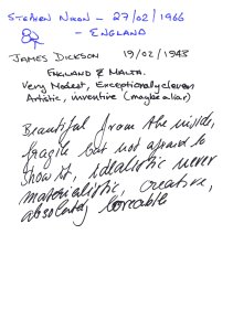 On the last page, we find three different comments. The first one has been contributed by Stephen Nixon from England, born on 27th of February 1966 and it is the only completely graphic comment in this guestbook. Stephen didn’t write anything – instead he drawn a strongman symbol, signifying that Pisces are not easily to break. Another note came from James Dickson who shares his time between UK and Malta. James wrote: “Very modest, exceptionally clever, artistic and inventive (maybe a liar)”. The last entry is anonymous. It says: “Beautiful from the inside, fragile but not afraid to show it, idealistic, never materialistic, creative, and absolutely loveable”.