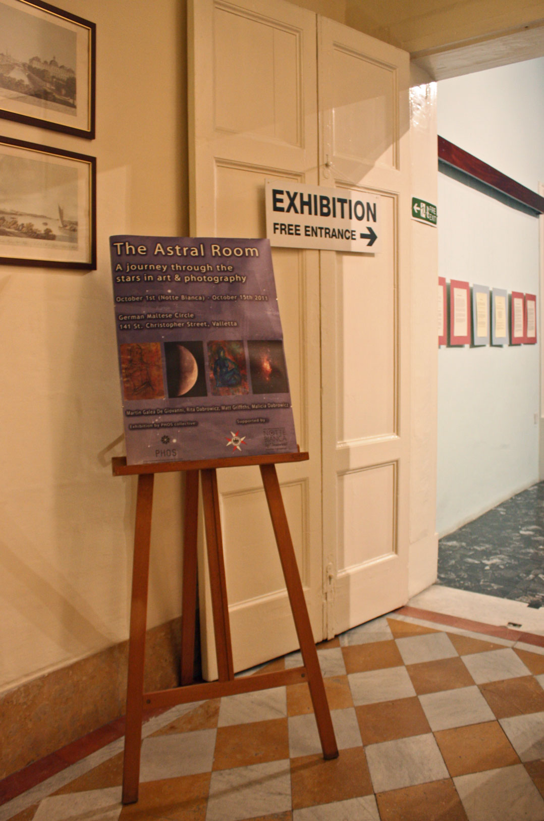 Our exhibition entitled “The Astral Room: A journey through the stars in art and photography” occupied two show rooms on the first floor of the Messina Palace between 1st and15th of October 2011. Before entering, the guests have been welcomed by a poster created by Martin Galea De Giovanni and a sign “Exhibition: free entrance” pointing in the right direction. Nobody could get lost! In the background, you can see the entrance to the first room with Martin’s short stories printed and framed.