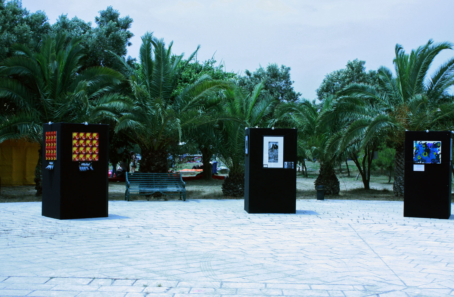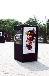 Having a lot of time on our hands, we started walking around, taking a closely look at the artists at work. It was a real hot, summer day and people were working tirelessly in full sunshine. We exchanged hellos and news with our friends and ended out helping those who needed an extra pair of hands. Malicia recalled cutting frames for one of the artworks of James Bianchi and helping him to attach it to the pedestal. You can see the artwork on the first pedestal from the right. More James’ pictures can be found here: http://www.flickr.com/photos/james_bianchi
