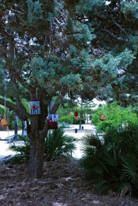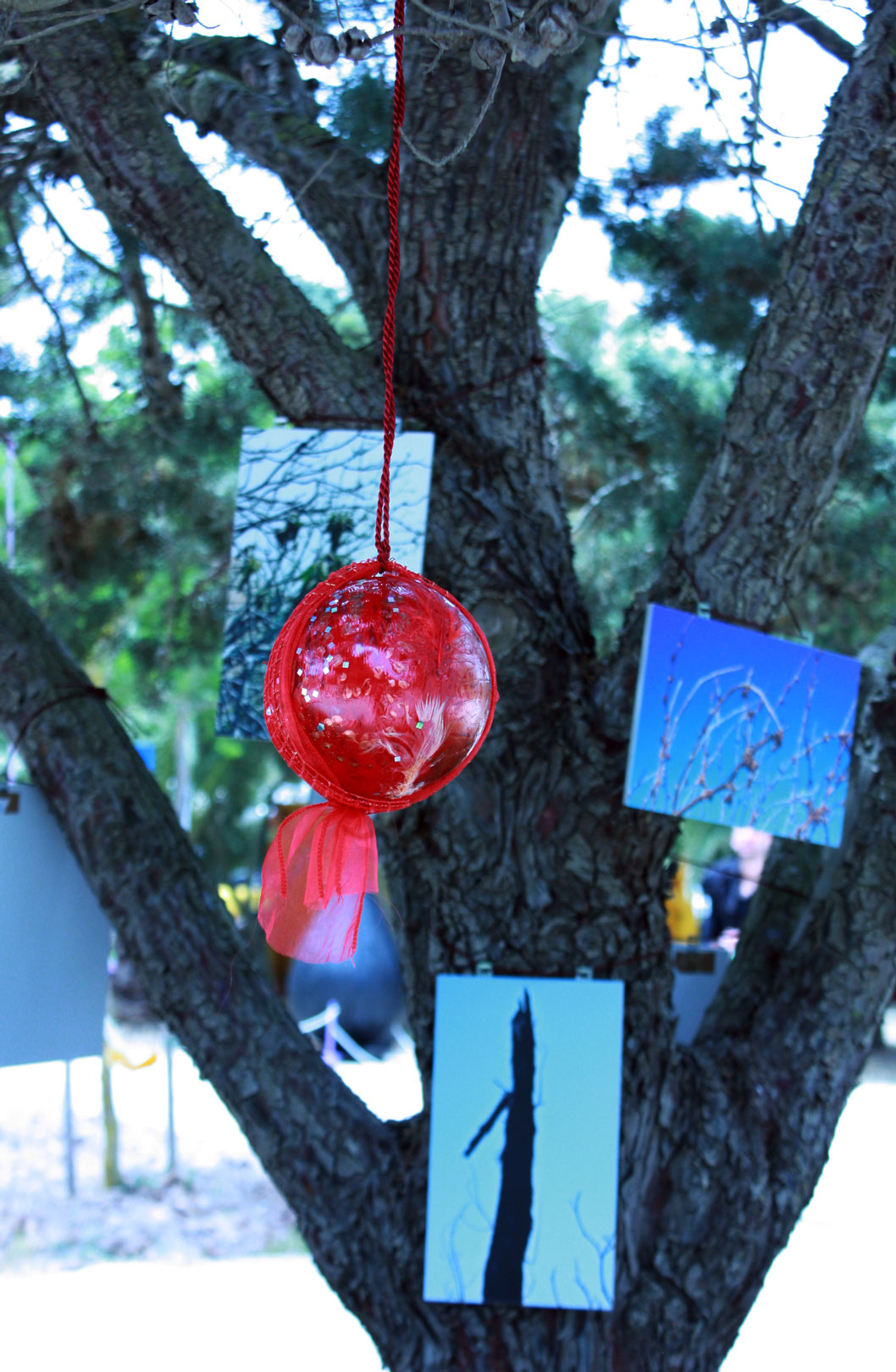 At midday, a time had finally come for us to decorate the Tree of Art. The concept was very simple: Malicia’s 8-piece photography series entitled “A mortal moment” has been attached to the tree’s trunk and largest branches. Rita’s orb series known as “Planet caravan” was hanged from the lighter, outer branches, circulating the whole tree. It took us about two hours to set everything up.