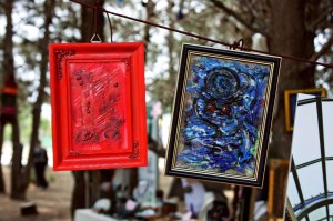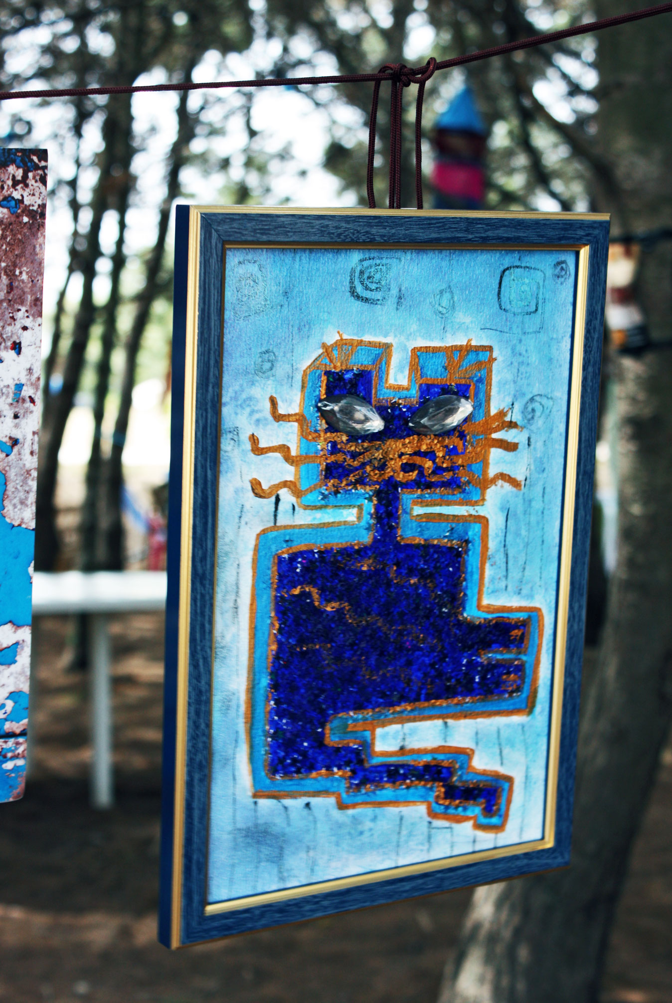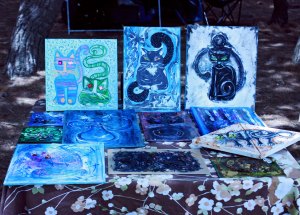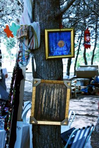 The nearby trees were also used. Mal attached several artworks to their trunks and branches trying to form a mirror image of the Tree of Art from the other side of the road. She succeeded – many visitors immediately recognized not only our style but also the concept. Some of them thought that the Tree of Art and our stand were connected and considered them the two halves of the same whole – especially if each half were „guarded” by a twin sister! Artworks displayed on this picture include: