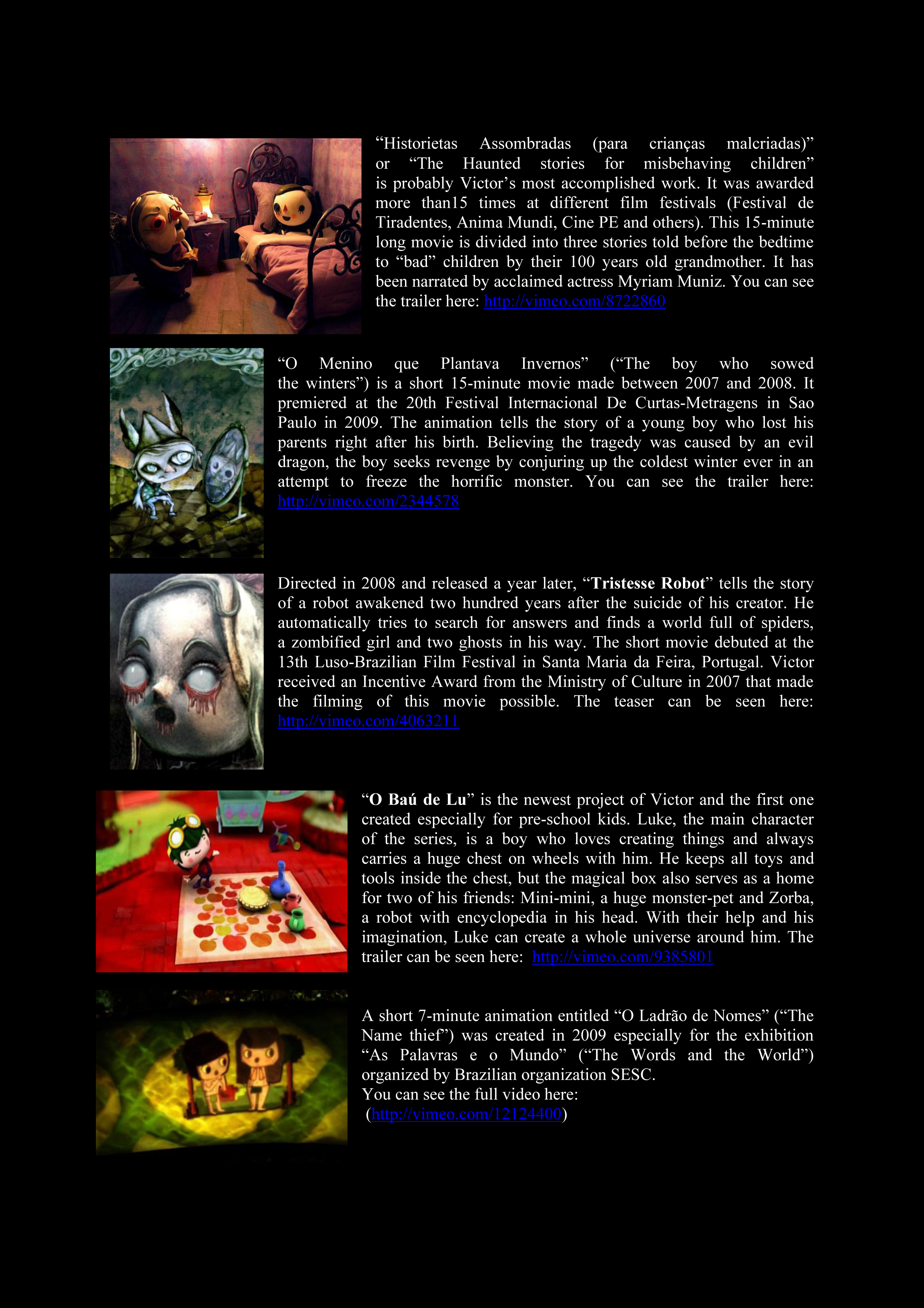 – “Historietas Assombradas (para crianças malcriadas)” or “The Haunted stories for misbehaving children” is probably Victor’s most accomplished work. It was awarded more than15 times at different film festivals (Festival de Tiradentes, Anima Mundi, Cine PE and others). This 15-minute long movie is divided into three stories told before the bedtime to “bad” children by their 100 years old grandmother. It has been narrated by acclaimed actress Myriam Muniz. You can see the trailer here: http://vimeo.com/8722860