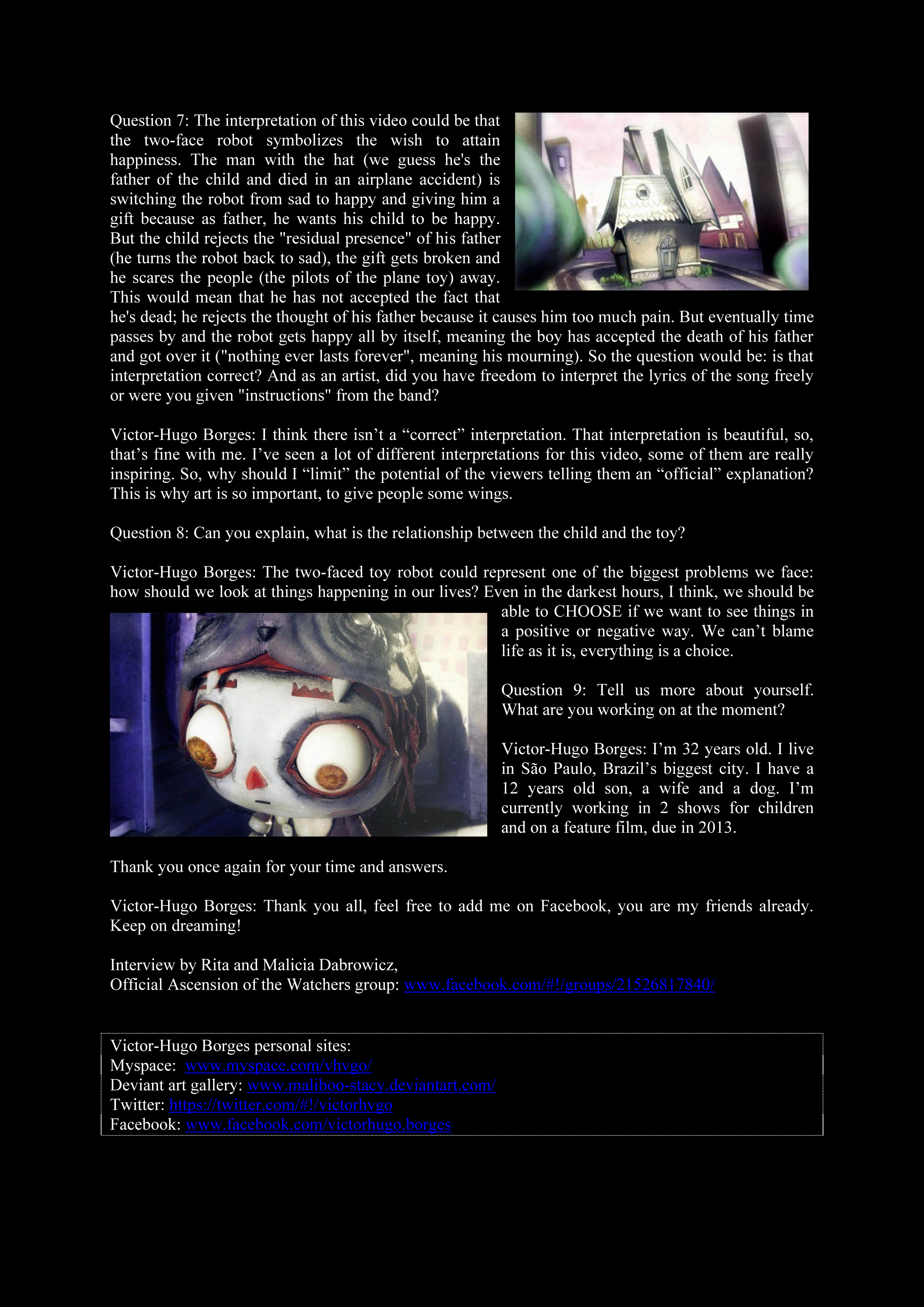 Question 7: The interpretation of this video could be that the two-face robot symbolizes the wish to attain happiness. The man with the hat (we guess he’s the father of the child and died in an airplane accident) is switching the robot from sad to happy and giving him a gift because as father, he wants his child to be happy. But the child rejects the “residual presence” of his father (he turns the robot back to sad), the gift gets broken and he scares the people (the pilots of the plane toy) away. This would mean that he has not accepted the fact that he’s dead; he rejects the thought of his father because it causes him too much pain. But eventually time passes by and the robot gets happy all by itself, meaning the boy has accepted the death of his father and got over it (“nothing ever lasts forever”, meaning his mourning). So the question would be: is that interpretation correct? And as an artist, did you have freedom to interpret the lyrics of the song freely or were you given “instructions” from the band?