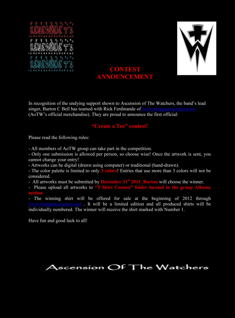 Rick approached me and mentioned that Burtonwas thinking of organizing a contest for AoTW fans. The contest was to design a new shirt for the band official merch and that Burton himself would judge.