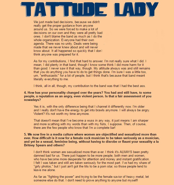 Page debuted around 2000 – and it may look very simple by today`s standards. However remember that Valerie was one of the first in the business to actually have her official page. And she was to our knowledge the only bassist in metal community to maintain this side of business at that time. It was through Tattude Lady that Val communicated her departure from Pist.On to her fans by publishing a special interview (another first in metal world!) – you can read it below, and it makes a fantastic addiction to our own interview with Val.Ium. See, we do spoil you!