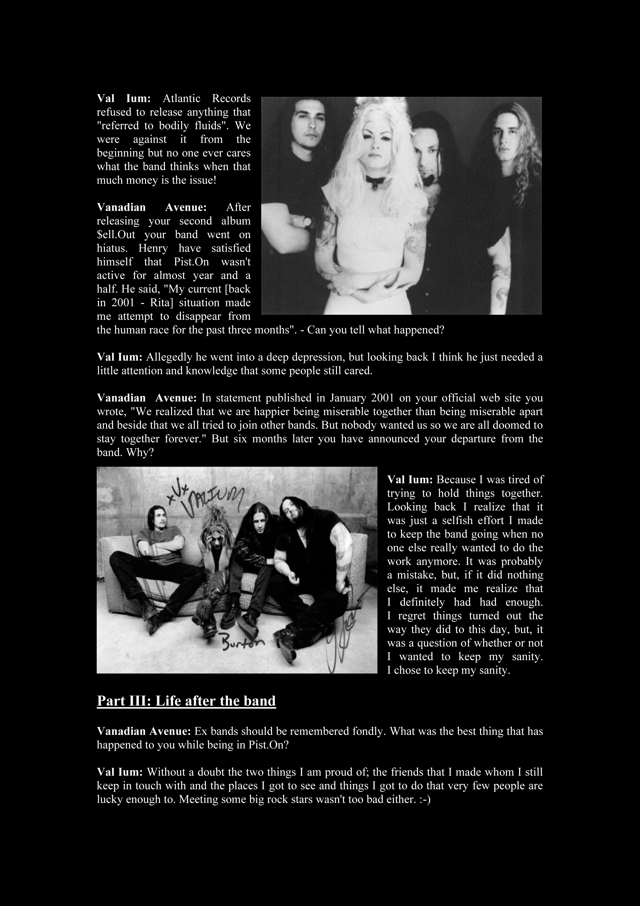 Vanadian Avenue: Ex bands should be remembered fondly. What was the best thing that has happened to you while being in Pist.On?