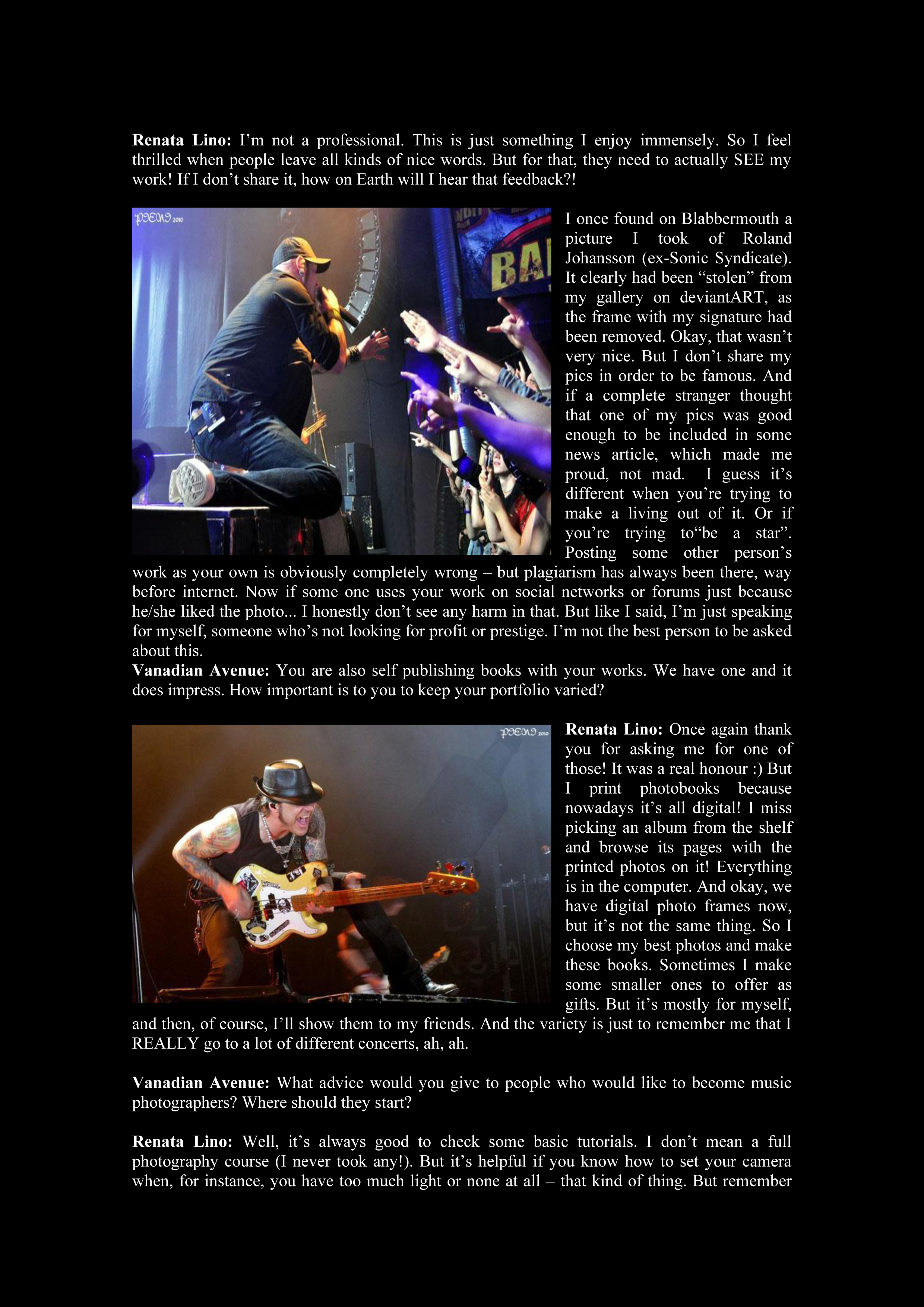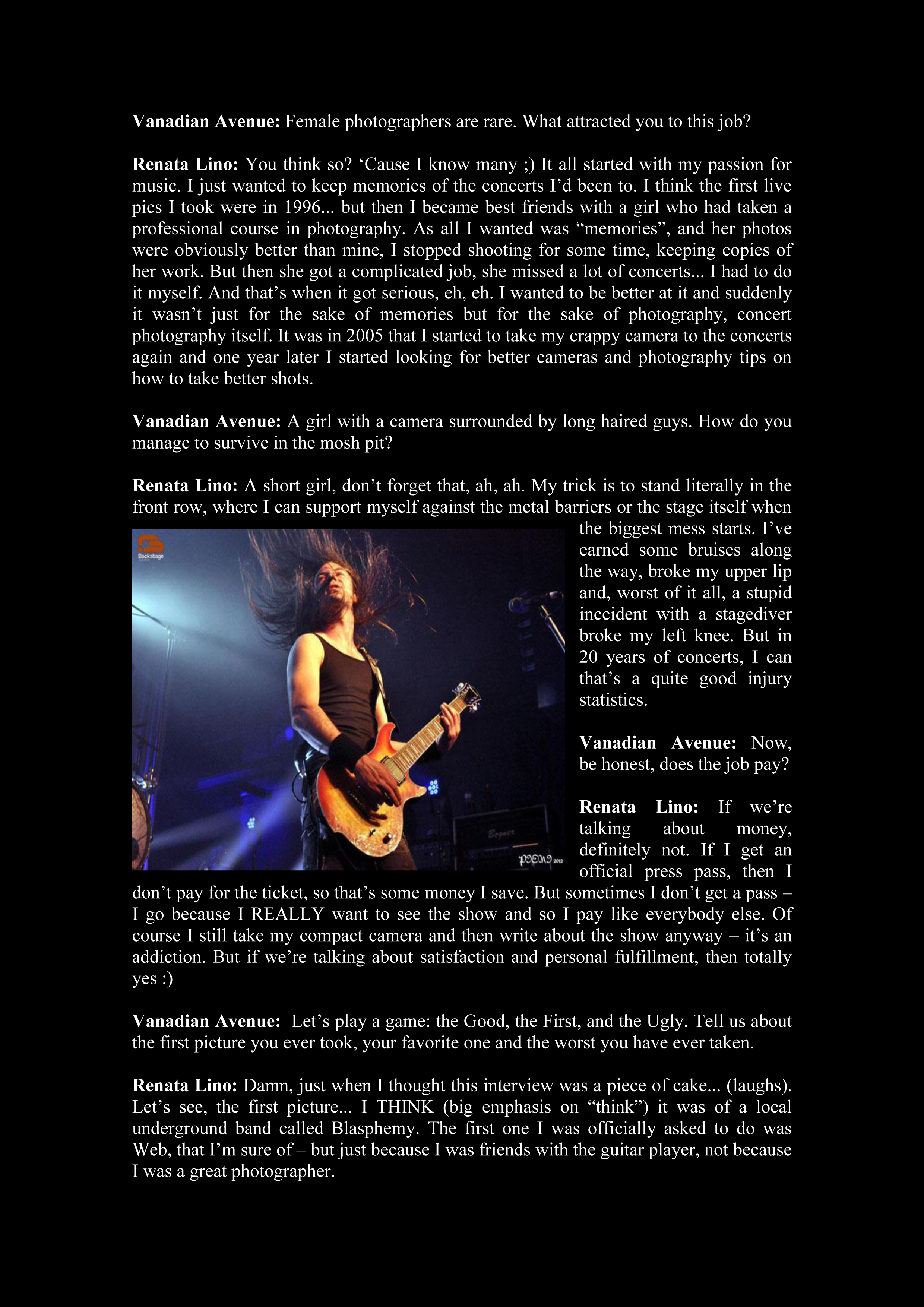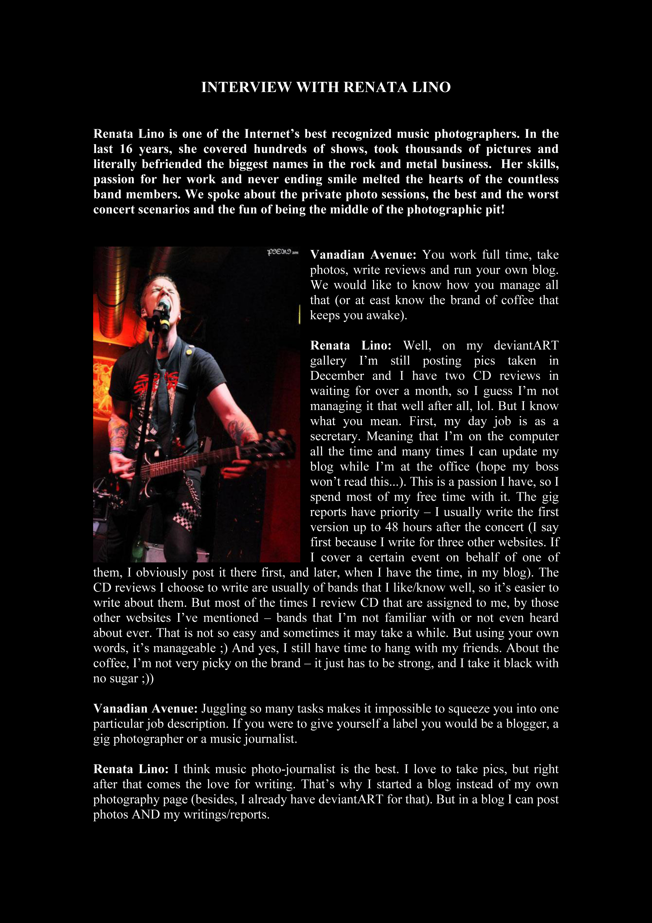 Renata Lino: I think music photo-journalist is the best. I love to take pics, but right after that comes the love for writing. That’s why I started a blog instead of my own photography page (besides, I already have deviantART for that). But in a blog I can post photos AND my writings/reports.
