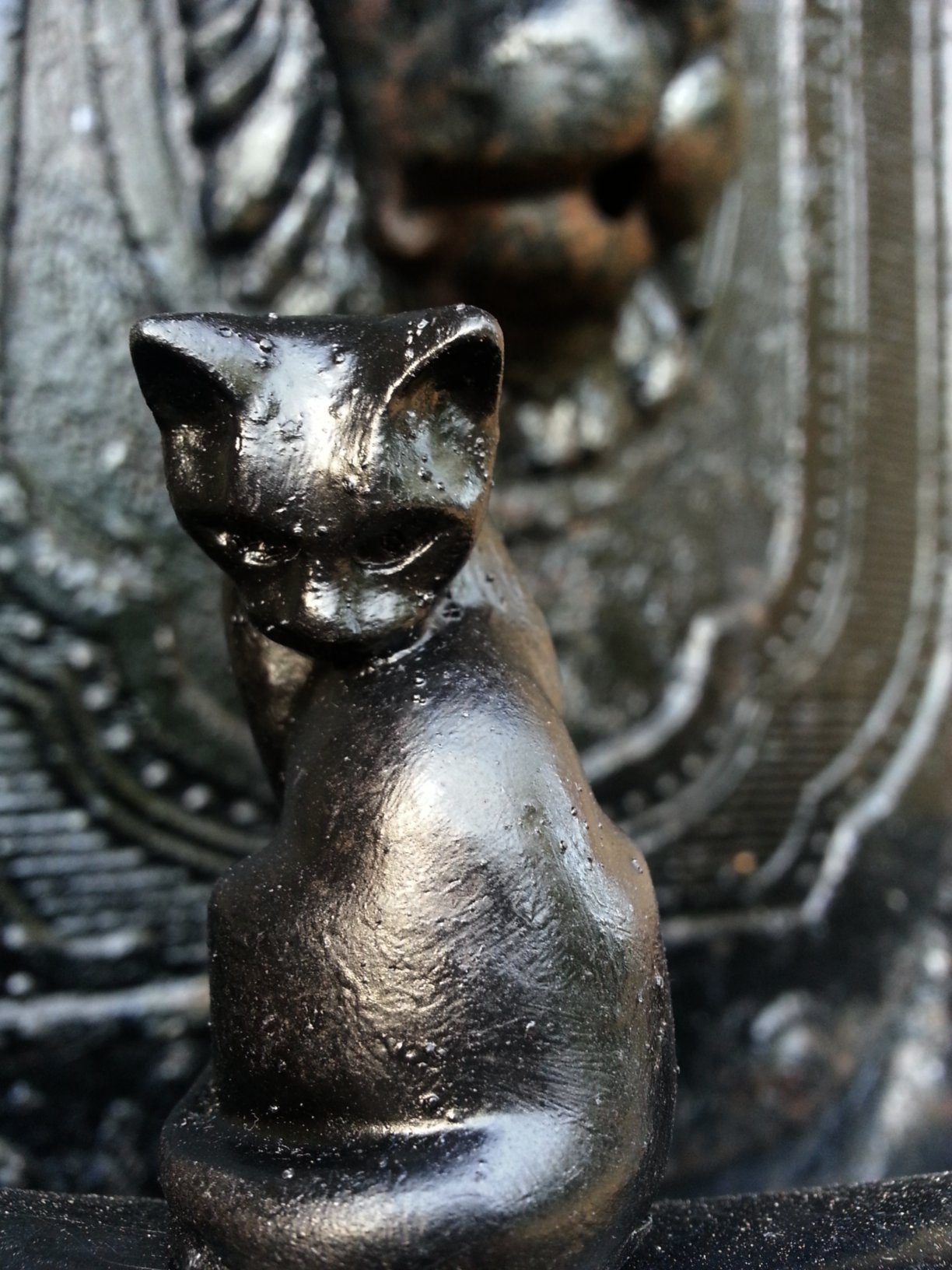 The three sides of a cat: Basking in the sun, The cat and the lion and Ivy hideaway.