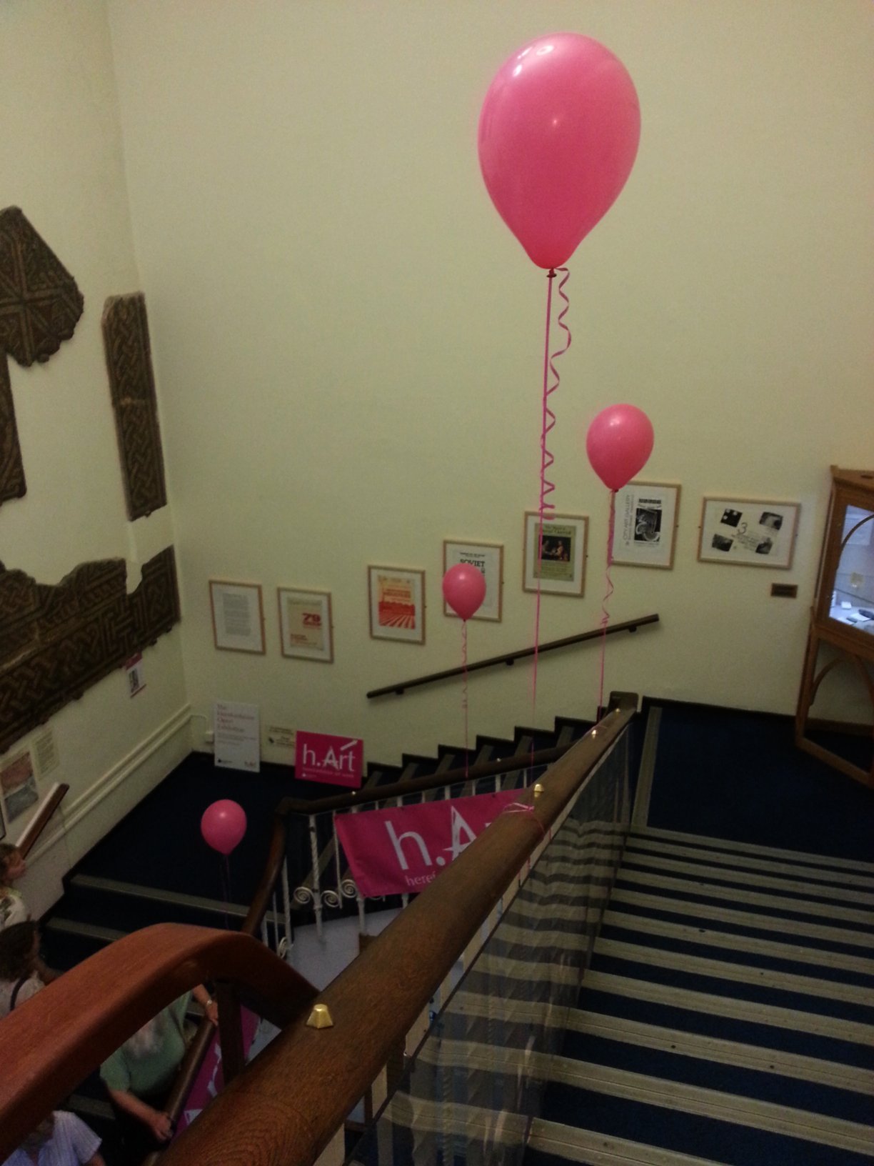 The first thing that surprised us was the pink balloons! They were everywhere: attached to the stairs, walls and ceiling, floating among the guests and being kept by guests and staff members. Several artists came fully dressed in pink and posed for photographs standing next to enormous pink h.Art banners. Rita asked one of them why they decided for this particular colour and the response was that everybody loves pink! The soundtrack was also very colourful: we had a chance to hear Cyndi Lauper with “True colours”, several Pink hits (including “Let’s get this party started” at the beginning), “Pink” by Aerosmith and the all time favourite “Pretty in Pink” by the Psychodelic Furs.