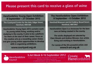 Hereford Museum and Art Gallery has been chosen very carefully as a host for the exhibition. Not only it is located in the same heart of the city on Broad Street but it also shares the building with local library and is well known to anyone who lived in Hereford for more than two weeks. Few days before the opening, a big billboard has been displayed on the balcony informing the general public of the exhibition. We have received our private pass from the owners of the Apple Store Gallery that allowed us not only to meet the artists and other Herefordian celebrities but also to have a glass of wine. A true VIP treatment!