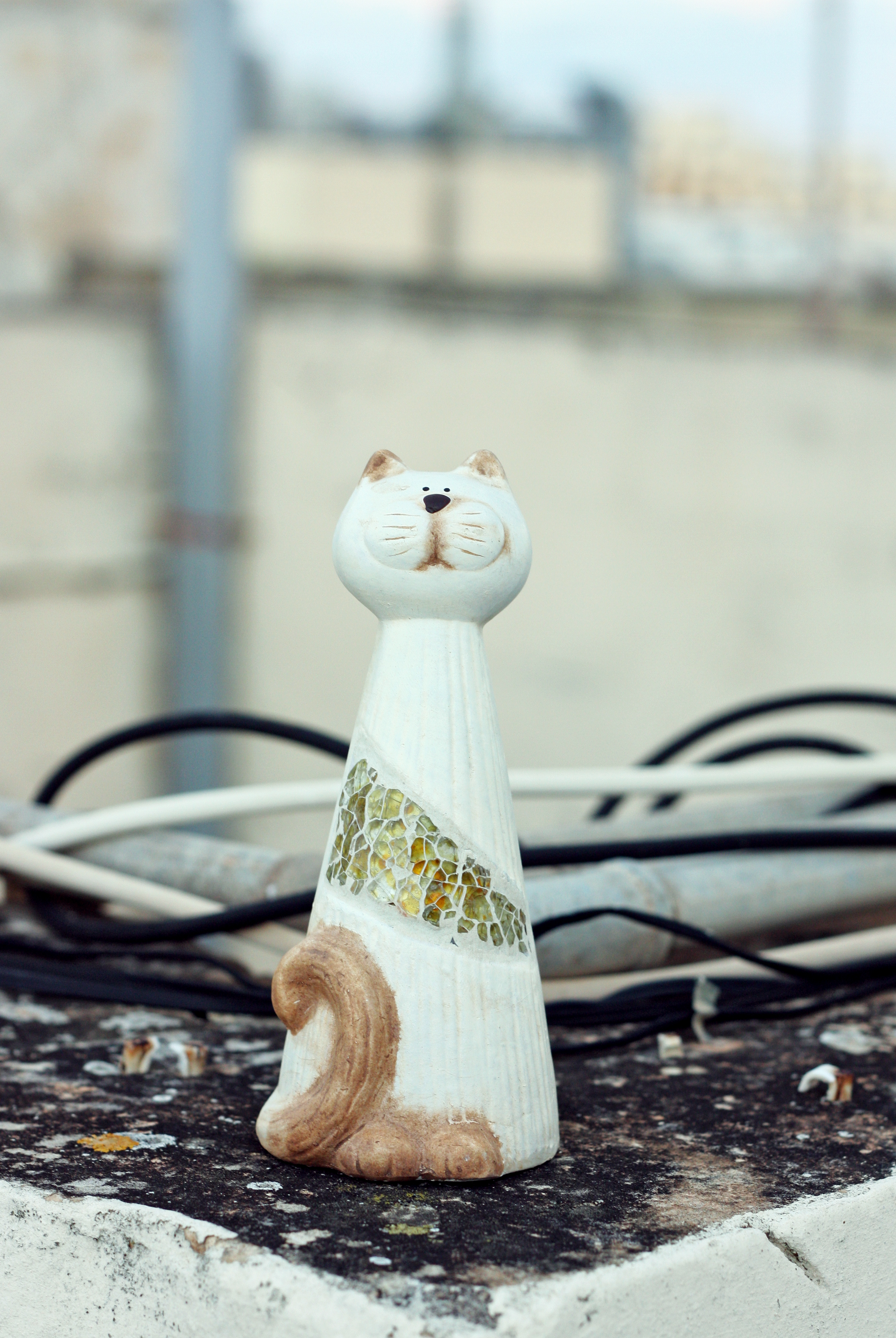 Hello cats lovers! Another Kat-a-log issue is here. Our first post in December and we are thrilled to show you the newest additions to the furry collection. If this is the first time you hear the name “Kat-a-log”, let us introduce the project in short. Our mom, Olympia Dabrowicz, has been a cat figurine collector for more than a decade now. She has gathered nearly 150 cat figurines made of glass, clay, metal, wood and any other medium you can think of. The felines come from different countries and continents and each of them has a great story to tell. So what Olympia decided to do was to take the cats outside, photograph them in various places (on the streets, rooftops, restaurants, gym etc.) and then post them on the Internet, turning the pictures into an art project. She has had a great success and many people we know brought new cats from their holidays and voyages, just to be featured here!