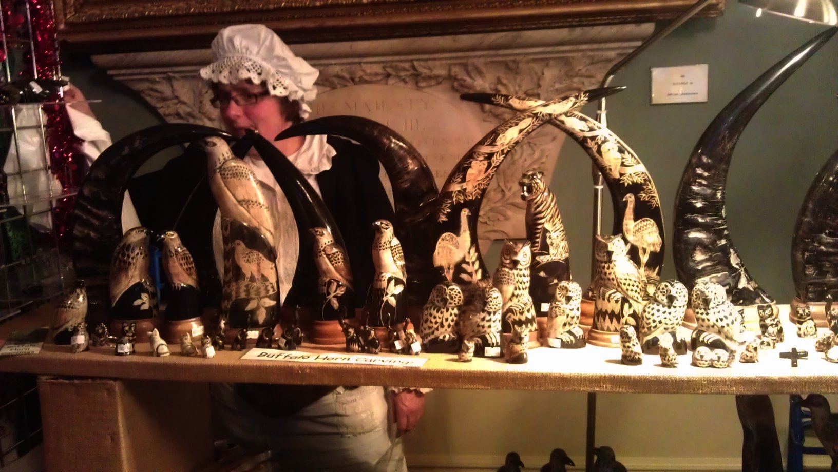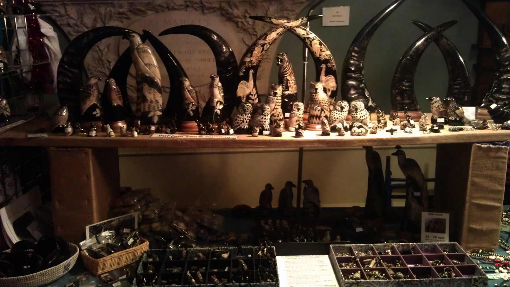 If you are a follower of Kat-a-log project on our blog, you are probably familiar with the name Thai Interiors. We have written about them in December when one of their sculptures joined Olympia’s collection. Thai Interiors is a fair trade company run by British volunteers who help the Thai artists earn an extra income for their arts and crafts. Emma, the director of the organization, travels to Thailand several times a year and brings the hand-made sculptures with her to the UK. They are then sold on local markets all over the country and all money collected are given back to the artists. Sculptures presented in the Guild’s Hall in Worcester were made entirely from the horns of water buffalos. Each piece has been polished and carved multiple times to receive their characteristic deep amber-coloured shading.