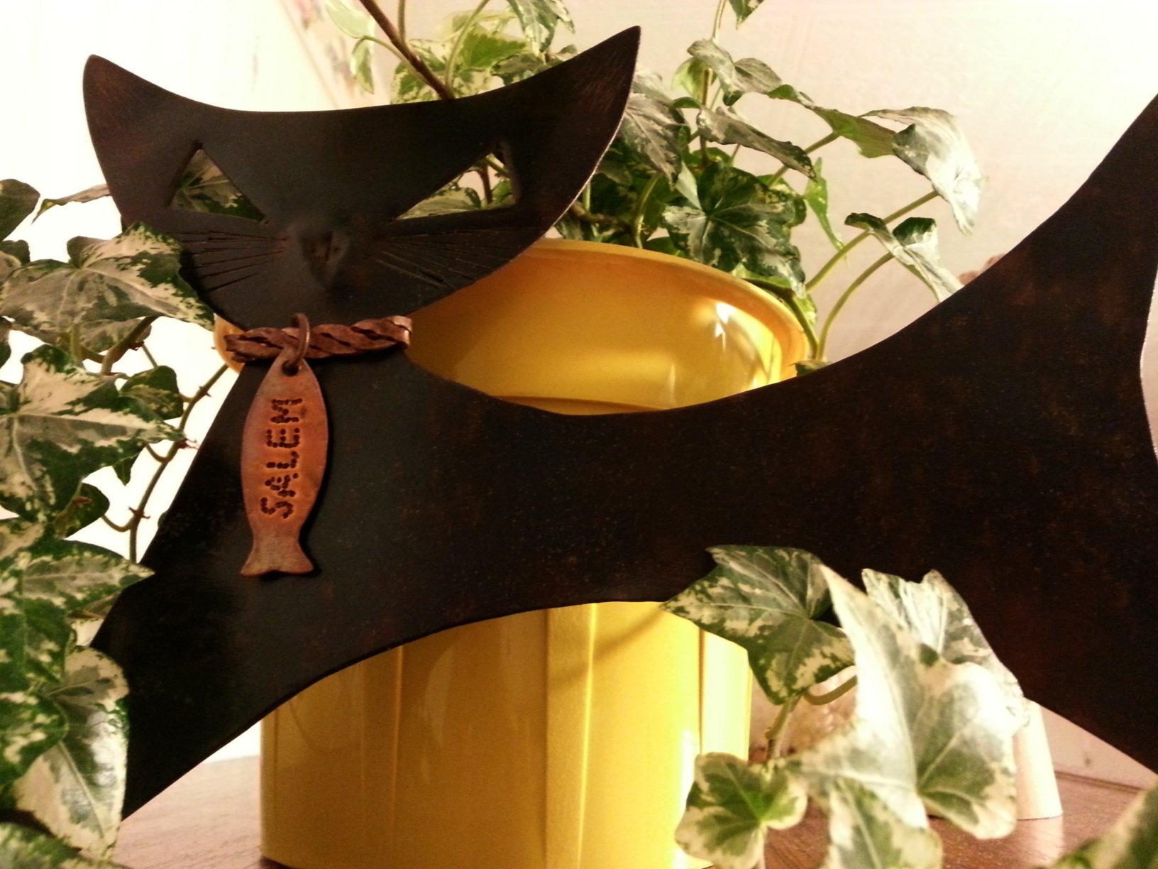 The majority of cats in Olympia’s collection has been bought as gifts from her family members and friends, but this incredible kitty is literally one-of-a-kind item. The hand-cut copper sculpture has been commissioned by Malicia and made by renewed UK artist Jackie Roberts during the Patches Market (arts and crafts festival) in Valetta. The order has been made on 25 of September and the sculpture was delivered on 14 of October 2010. As you can see on the pictures, the cat has a metal collar with a small fish shaped tag that says “Salem”. This is a reference to Olympia’s favourite black feline – a real cat we must add! Another interesting fact is that the background for the first picture has been provided by Olympia’s original abstract artwork.