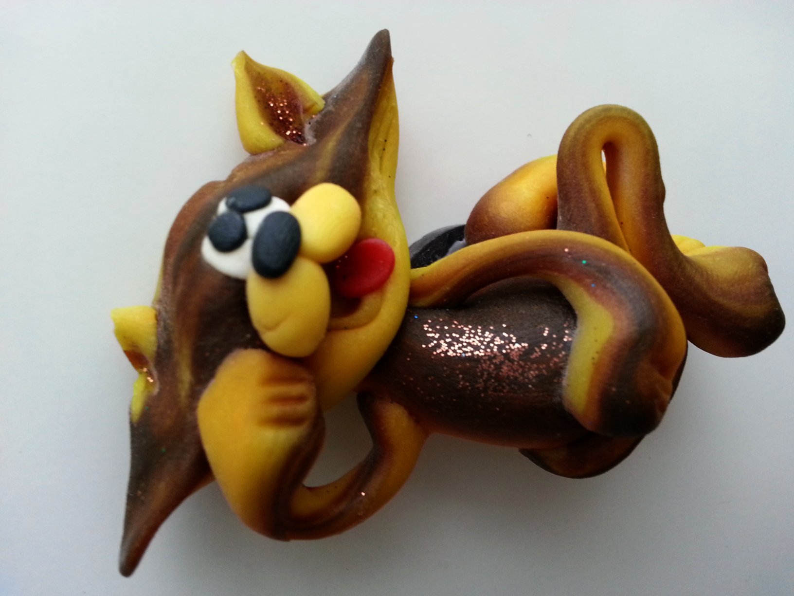The Kat-a-log project is a family business thanks to involvement of relatives and friends, but sometimes Olympia herself goes cat-hunting. This was the case of the glittery fridge magnet that Olympia spotted in our hometown of Piekary Slaskie, in a local store, not far away from our grandparents’ house 🙂 It is a perfect example that sometimes you don’t have to look very far to find a real treasure. We do not know who made the cat, but the artist is responsible for an entire animal collection. Our fridge is decorated with several of his creation including a rare yellow mimosa butterfly and a peacock. Judging by the vibrant colours, Kaolin based modelling clay has been used to make the cat and a small black magnet keeps the kitty in place!