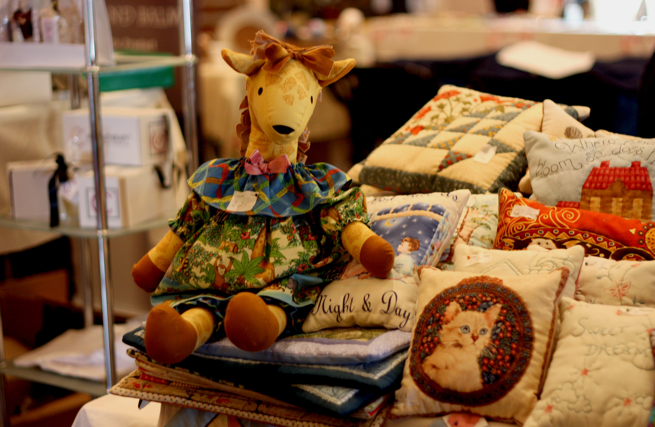 Do you know that everything happens for a reason? It is hard to believe but even the most unpleasant or stressful situations always lead to a happy end. We would have probably missed the lovely ladies at Hilda & Anna Quilting & Patchwork and Design Matters Ltd, if it wasn’t for an unfortunate confrontation at other stall (we won’t reveal the name). Mal has approached one of the exhibitors to take several pictures for the blog, when the owners angrily started to shoo her away. We were told to leave and not take any pictures. Before the discussion turned really sour (enough to make the babies cry), we have been approached by Hilda and Anna. They had nothing against us taking pictures, they even asked to have copies sent to them. We didn’t just stop to take few snapshots – we bought three pillows with cats for Kat-a-log project! Olympia is at cloud number nine and cannot wait for the parcel to arrive. Both artist are very skilled with needles and can make everything from patchwork rugs, traditional quilts, mascots (you should see the penguins and a giraffe!), pillows and bed covers. Hilda and Anna are well known to Artisan market visitors as they also participated in market in 2011 in Senglea. Please wait for a new issue of Kat-a-log to see pictures of their kitten-friendly crafts!