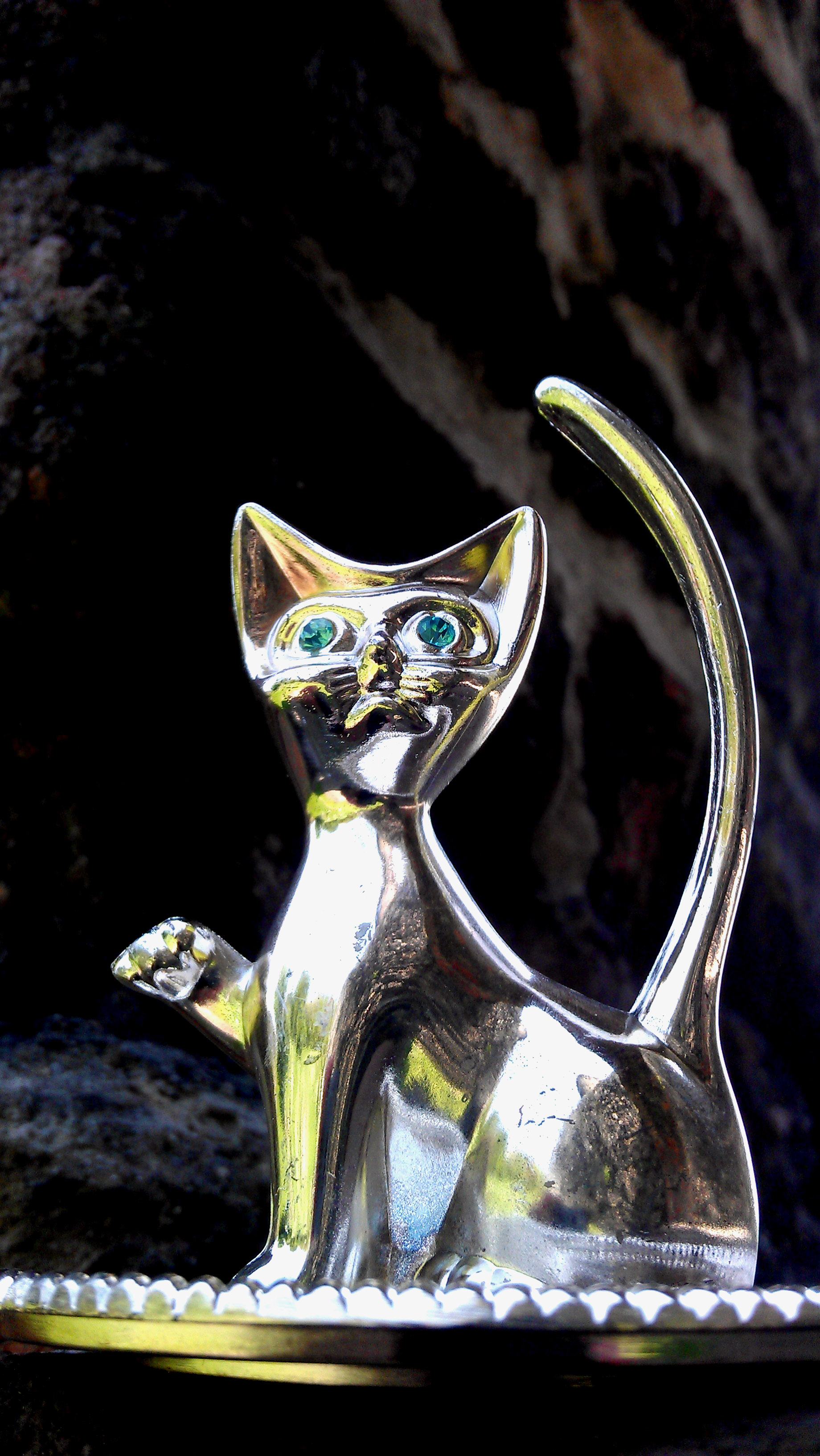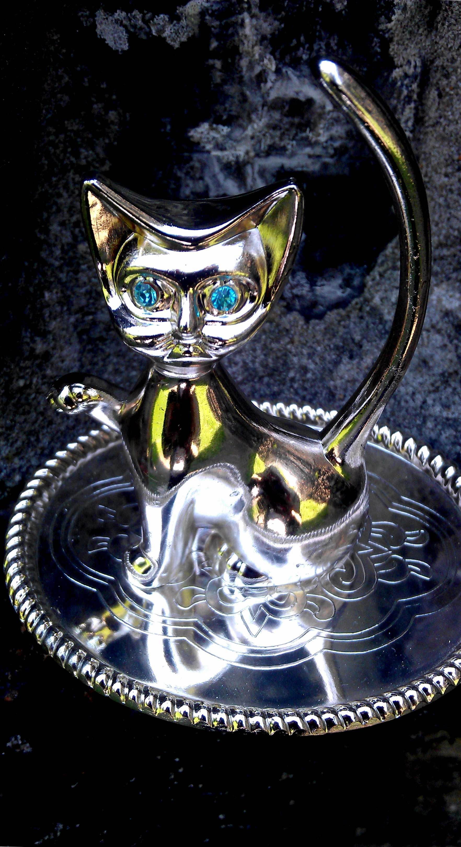 You wouldn’t believe, but this kitty with a long, pointy tail is actually a ring holder and not a figurine. It is made from a stainless steel with two blue cubic zirconias for the eyes. It has been made in Hong Kong and delivered as a holiday gift from Chris, a very nice guy from Rita’s previous job (Hi Chris!!). Chris and his fiancee traveled to China to visit some relatives in 2010 and returned with this kitten. Olympia had never seen a ring holder like that before and was very impressed with the design and idea for a accessory hanger in a shape of a cat. The cat is standing on a small plate decorated with elaborate flowery pattern. Sadly, we do not know who is responsible for manufacturing a cat like that as Chris removed the price tag. He didn’t want any money for it and Rita is still owning him a favor!