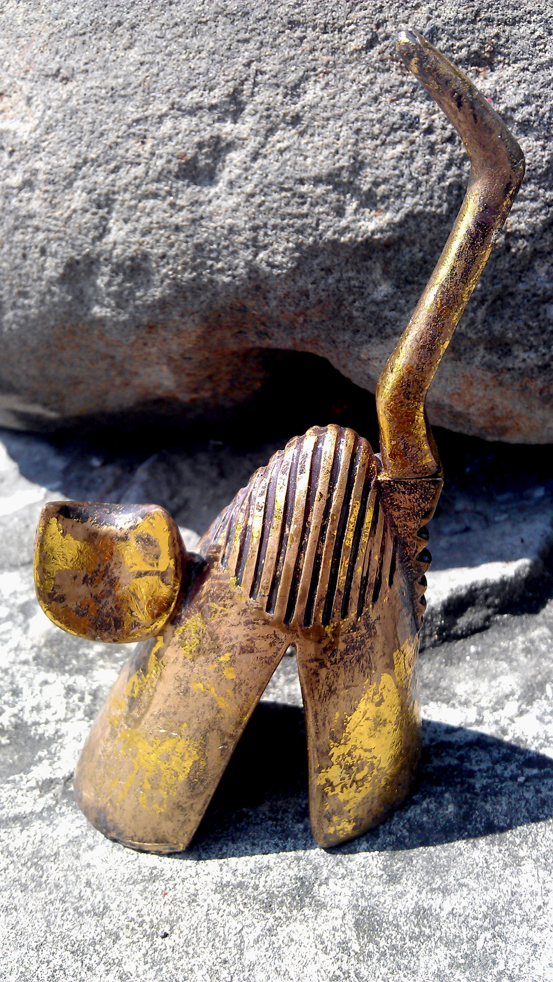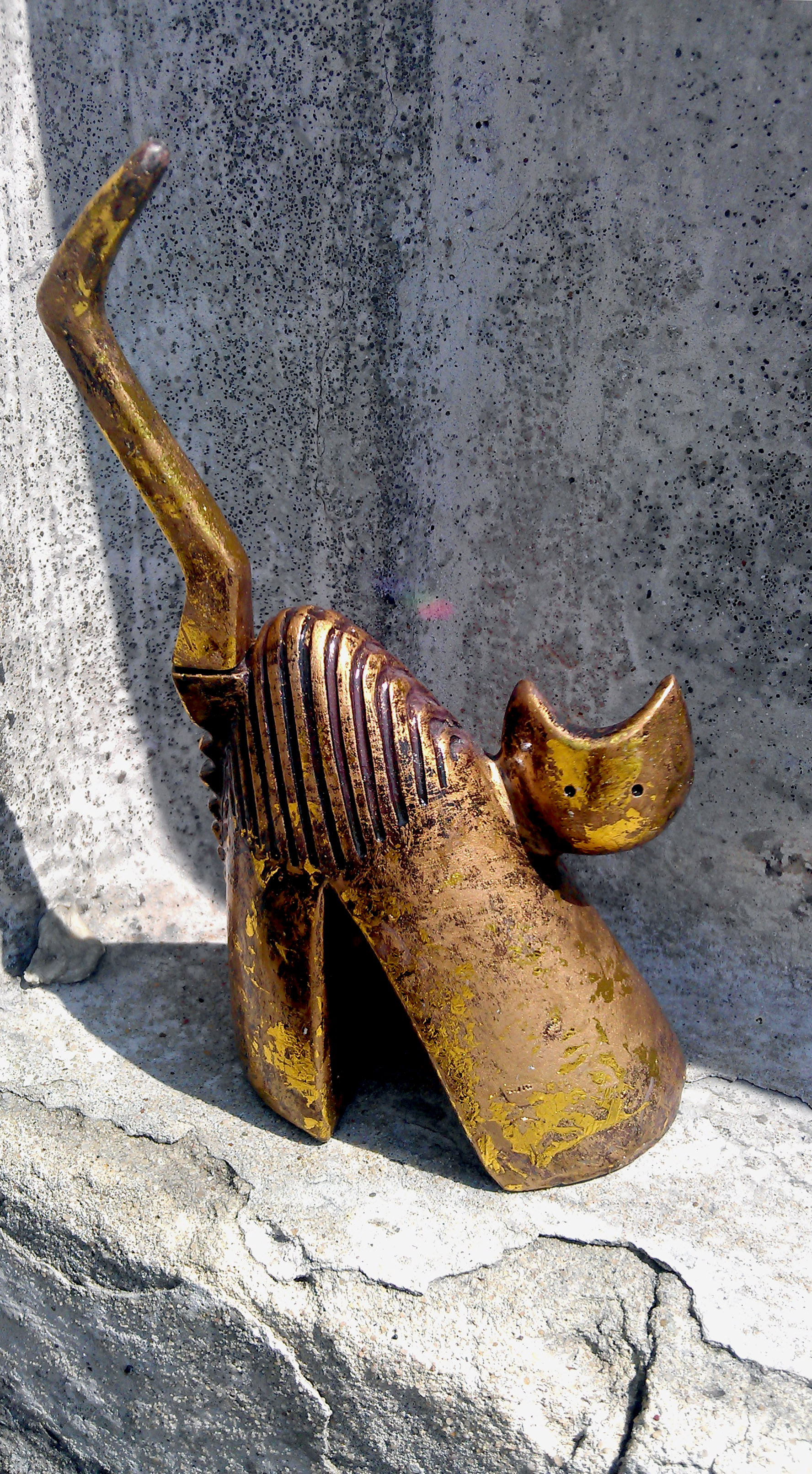 Do you remember Kat-a-log Feline no. 58 from our previous edition? It was very heavy, big and had massive whiskers made from straw? If you are struggling to remember, please click on the link to the 15th edition of Kat-a-log and look at the last cat featured there. Feline no. 60 has been bought in the same place as number 58 and it was also a gift for Olympia from our father. The cat was purchased in Black Red and White shopping gallery in the city of Bedzin in September 2010 as a 32nd wedding anniversary gift. The best thing about the cat is the tail. If you look closely at the pictures below, you will notice that it can be easily removed and re-attached again to the resin figurine. The secret is simple – the tail has a small magnet at the end! No magic here, but this is the only cat in the whole collection with a magnetic tail! Very clever design but people holding the cat have to be careful. We had several guests expressing desire to take a closer look at the golden cat (it is known to us as Goldie) and then freaking out that they have destroyed the cat when its tail fell off 🙂