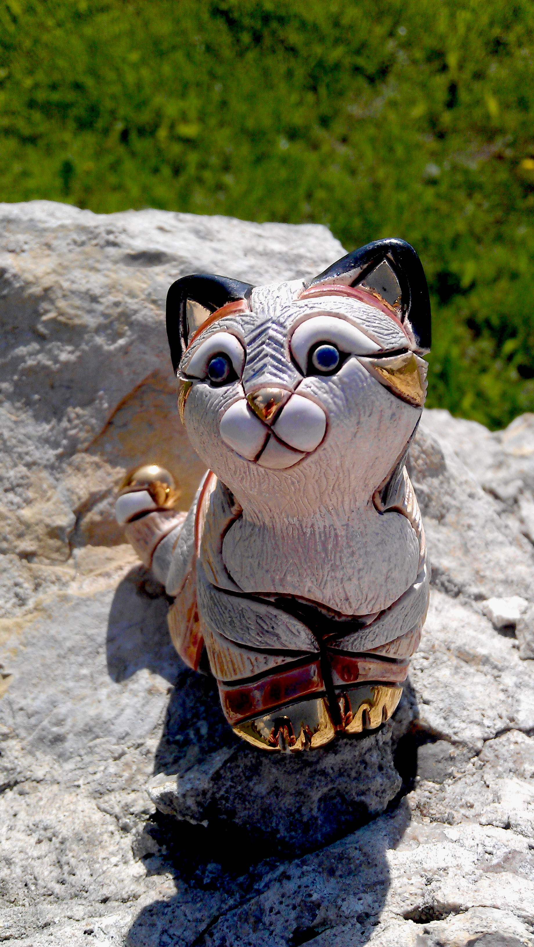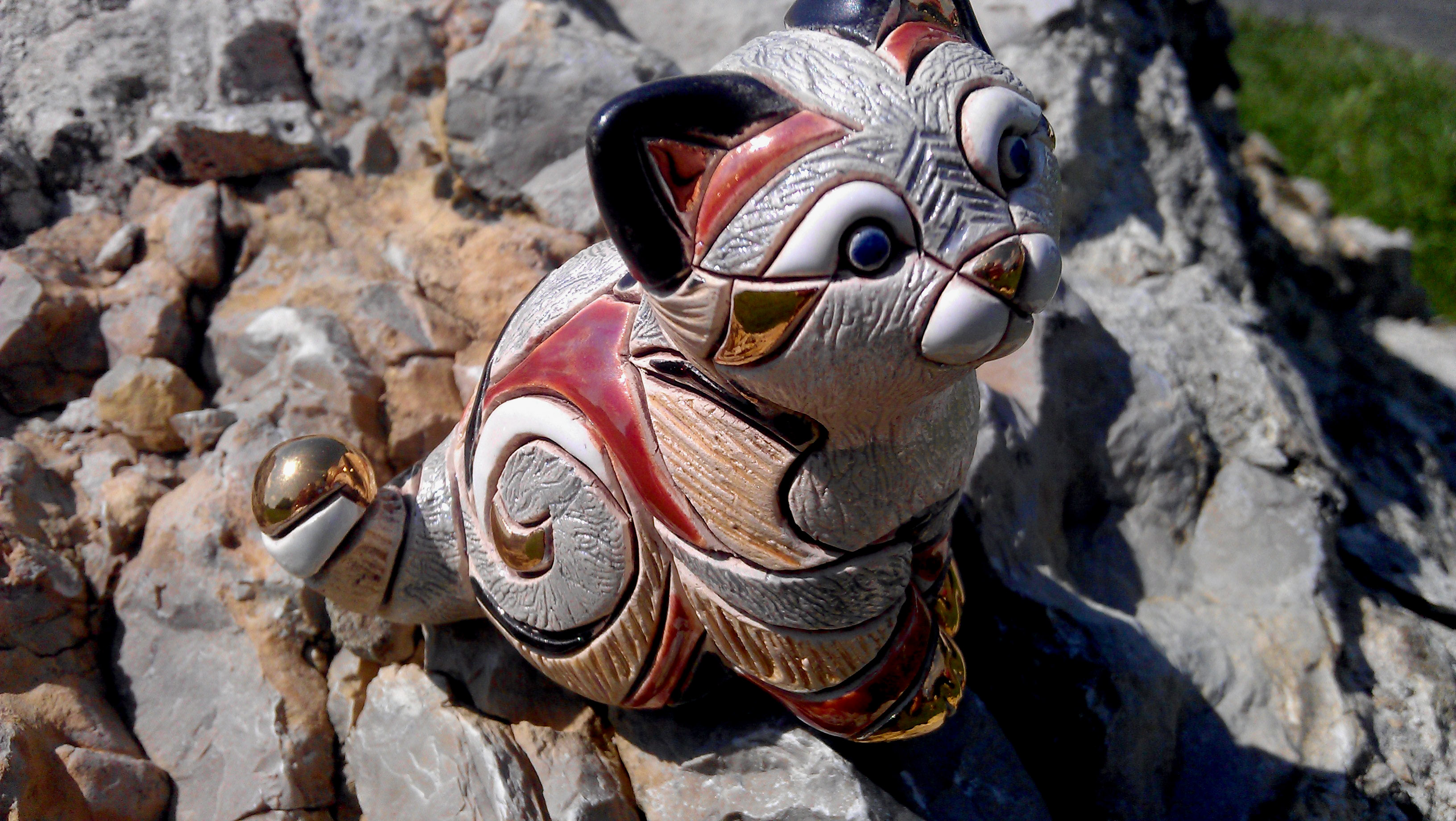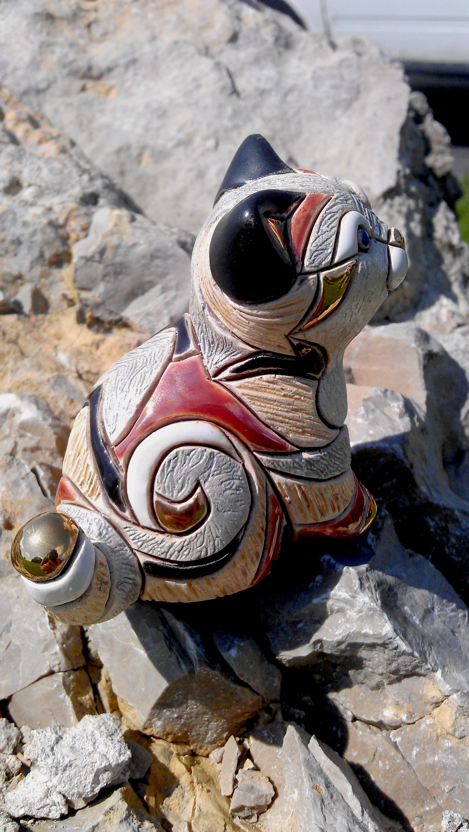 Kat-a-log Feline no. 62 is cute as a button! It is tiny but surprisingly very heavy. The kitten has been made from ceramics and has several colorful porcelain stripes on it: gold, red, black, silver and blue. The golden stripes are additionally painted with high gloss varnish, giving the cat almost mirror-like finish. If you are truly observant, you will easily spot Rita’s reflection holding her camera appearing in the tip of the kitty’s tail! Mal has bought this little fella in Berlin while living there in the early 2000’s. The figuring has a small black mark at the bottom probably made by the artist or manufacturer, but after so many years, we are unable to decipher what it says. If you recognize the maker or the artist responsible for creating this kitten, please let us know! The photo-session has been taken near the Bedzin castle, the first castle at the popular Trail of the Eagles’ Nest trail.