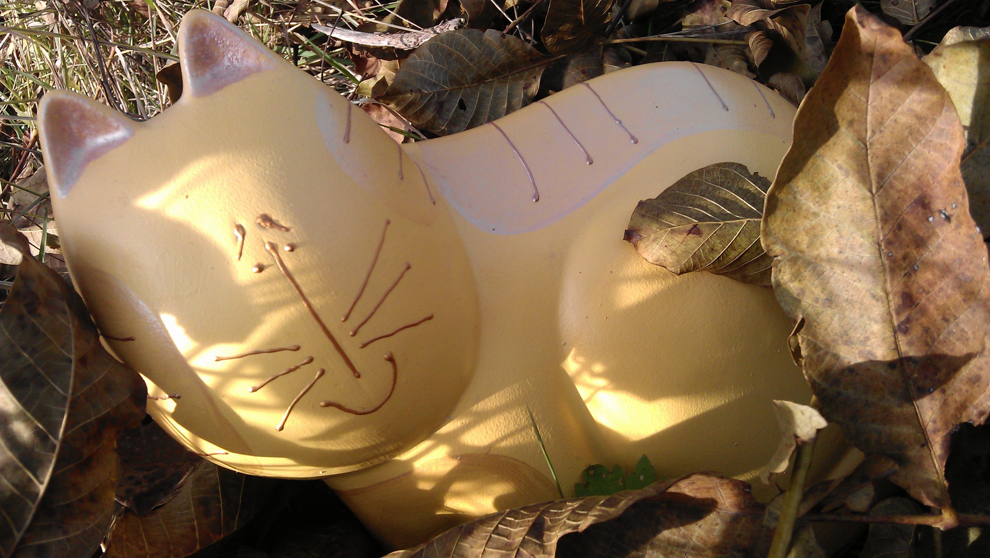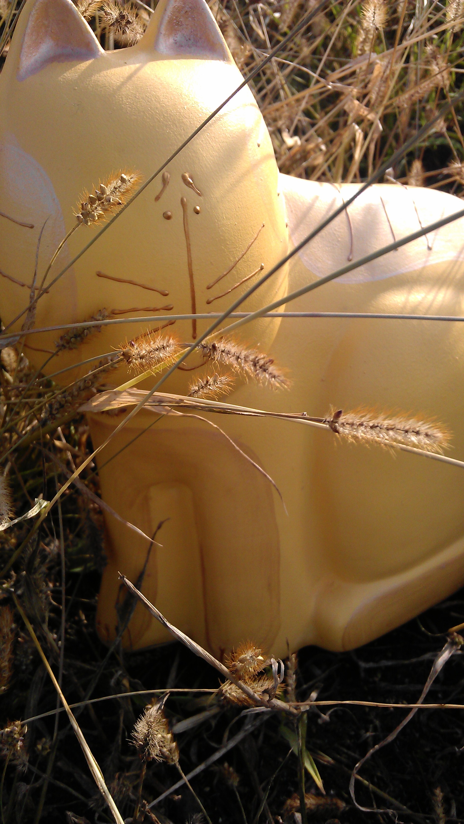 Kat-a-log cats number 74 and 75 have a lot of common: both were bought in the same place, they were chosen, purchased and photographed by Olympia alone and they are the biggest pieces in the entire collections. This massive, yellow cat-shaped monster is known as Sunshine. He is heavy like a ton of bricks but extremely cute, with a large grin that would make the Cheshire cat jealous. Olympia bought him on Sunday 28th of June 2009 in Piekary Slaskie, at the same market organized to commemorate the martyred deaths of St. Peter and St. Paul, the patrons of the parish where Rita and Mal have been born and lived before escaping abroad J Sadly we do not know who made the cat, but as far as we remember, Olympia has picked him from among other felines at the artist’s stall. It is safe to assume, that this gorgeous giant of a kitten has been made in Silesia. Have we ever told you that we like big hand bags, big cats and small dogs? Now you know! 😀