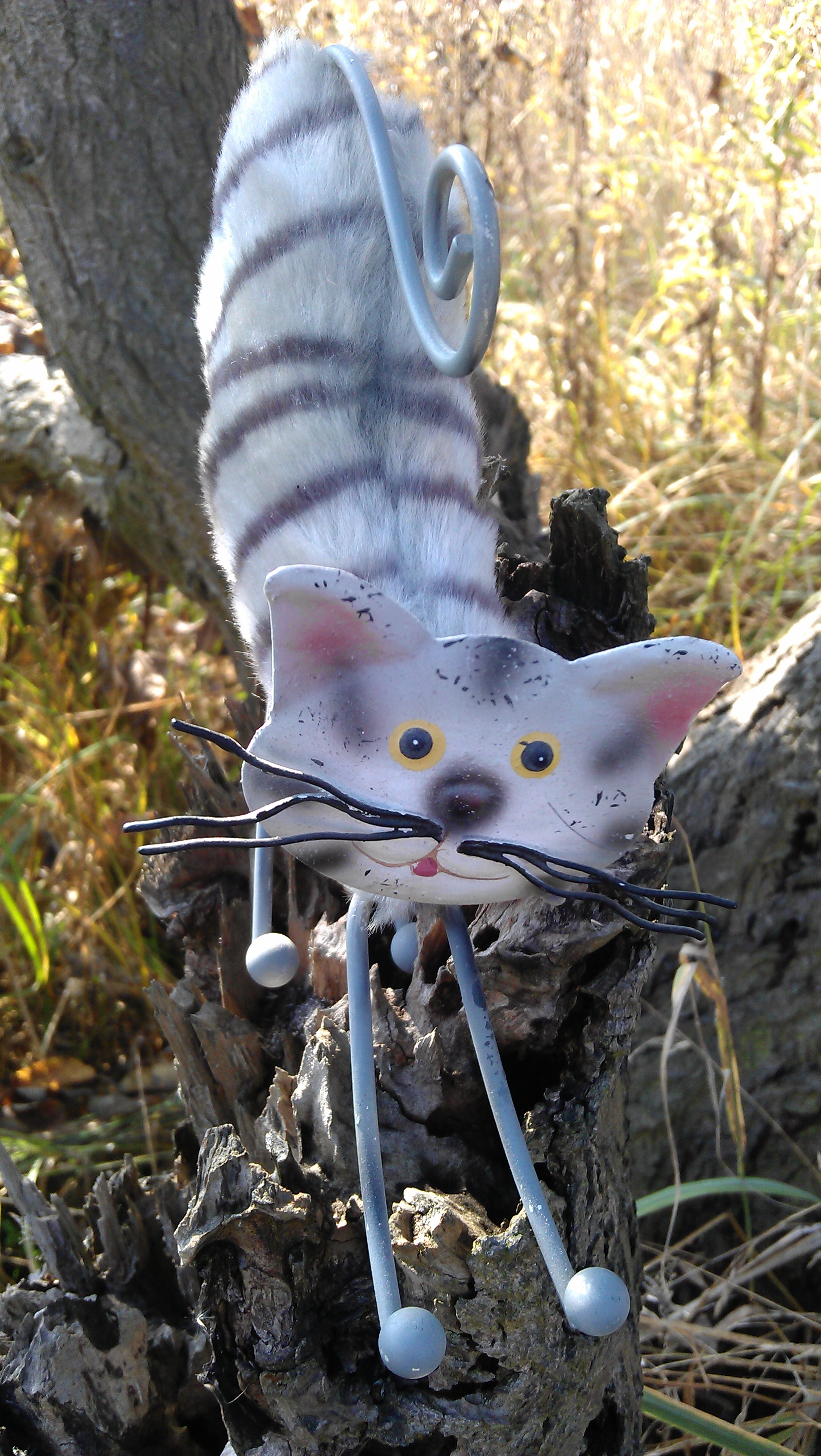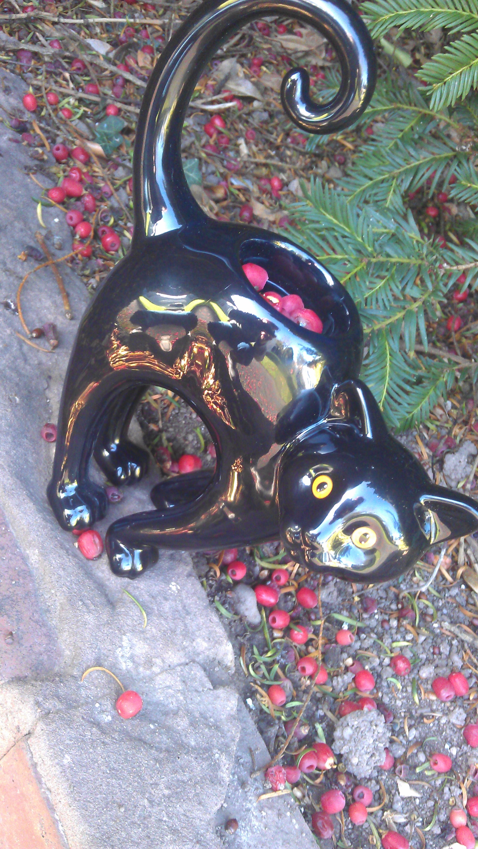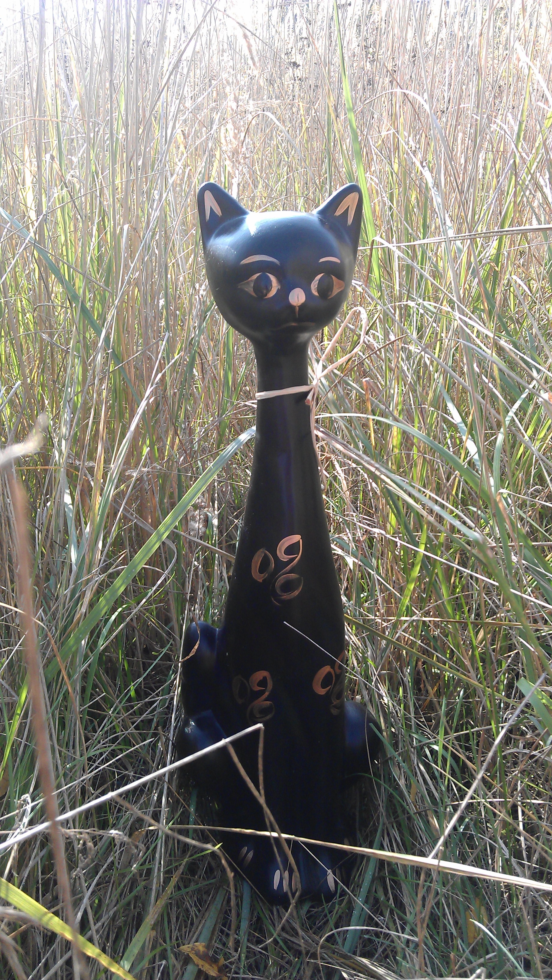 Rita has spotted this black beauty on the High Street in Worcester exactly on 20th of October 2013 while shopping for birthday cards for Mal and Olympia. This very delicate, china porcelain cat was displayed proudly in the main window of Clintons Cards as a part of their Halloween decoration. It was a bit expensive, being initially priced at 25 pounds. As the time went on and Halloween got closer, the price for the cat was successively lowered, first to 20 and later to 15 pounds. At that moment, the black cat figurines (and candle holders) literally started disappearing from the store. Rita has been given the cat on 29th of October as a b-day present and it was the last item available for sale. Photo shoot for the kitty has taken a place in Hereford on 3rd of November during the Flavors of Hereford Food Festival in a secret garden on the grounds of The Cathedral School. The garden is usually closed for the public but it was opened during the festival and housed a large collection of naturalistic sculptures. While being a part of the Kat-a-log collection, the black kitten will remain in the UK in residence in Worcester