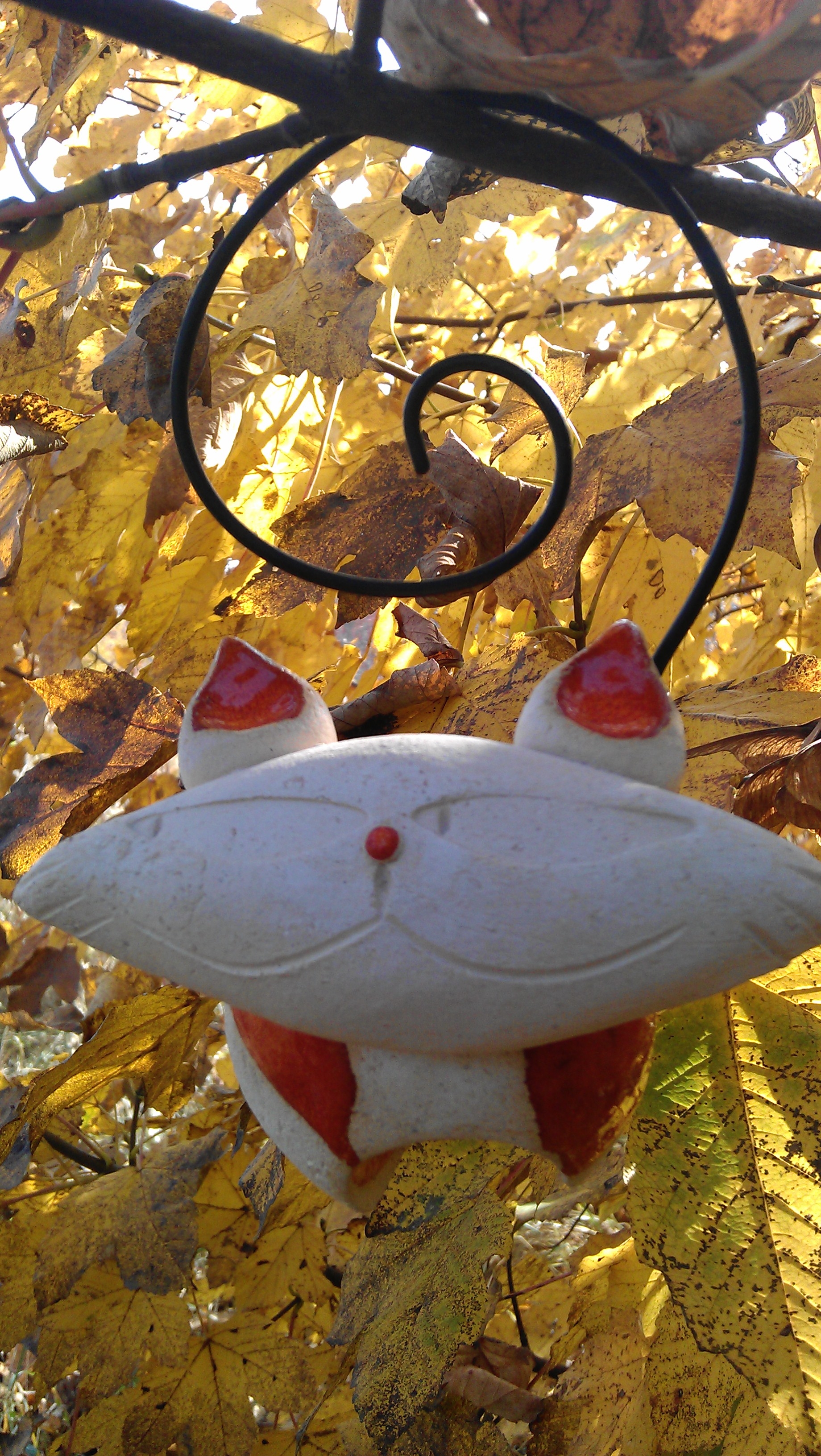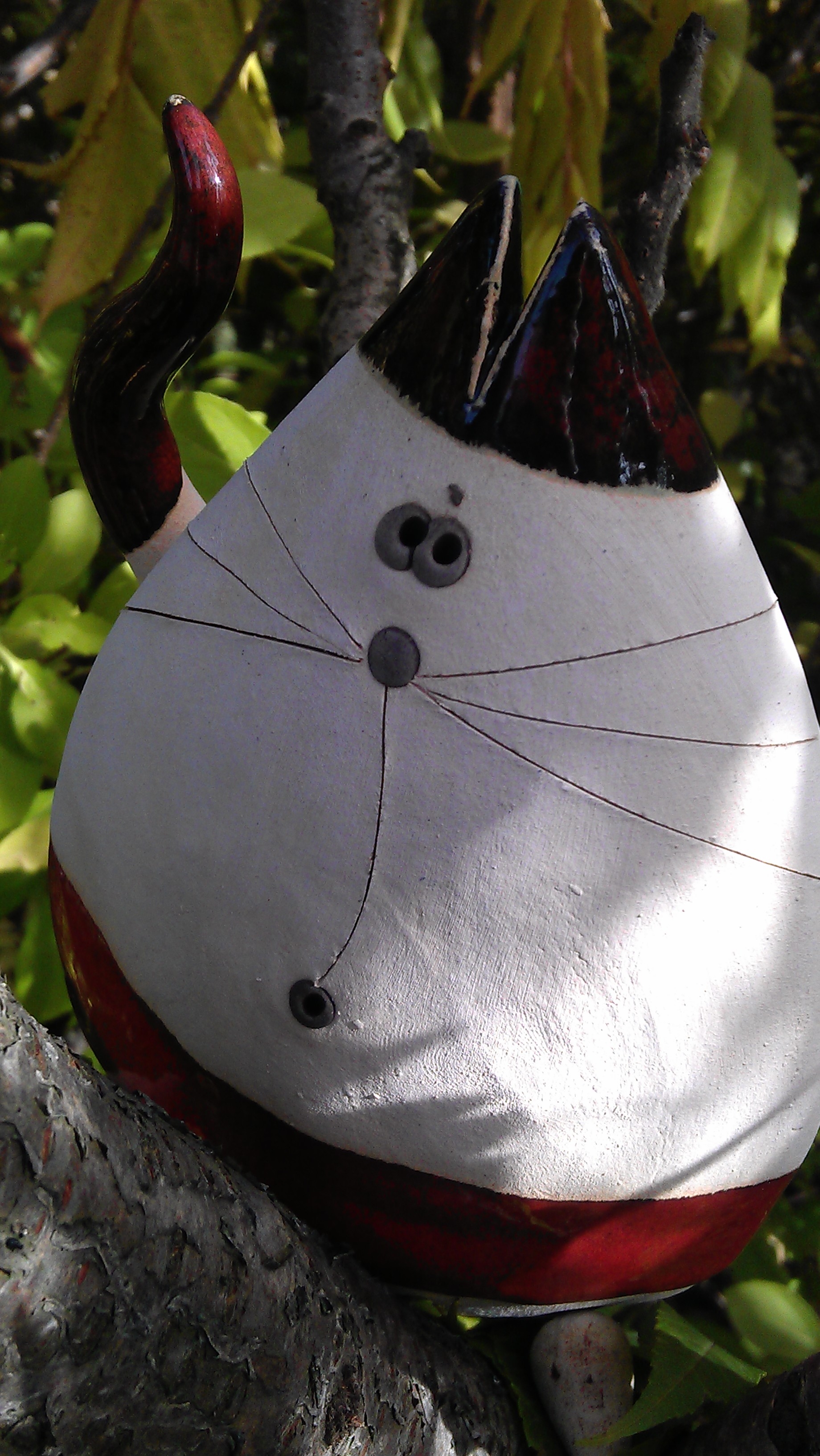Would you believe us that feline number 82 is probably the heaviest cat in Olympia’s collection? This grinning cat weights about 5kg (or 11 pounds), and is made out of two big chunks of thick ceramic, well four if you count the ears. It has been bought in 2009 in Wroclaw during the International Art Festival organized on the main city square. Rita remembers that she found the cat on a ceramic stand among garden statues of frogs and turtles. The artist who made the cat was either Australian or New Zealander and she needed to dance for the cat to be sold to her! The local customs of the artist requires the buyer to give the artist something else than just the money, so Rita decided to make few pirouettes. The price was 45 PLN (Polish zloty), the equivalent of around 5 pounds. As you can see on the below pictures, the cat has a long metal tail, perfect for hanging from the tree branches. We have to admit of breaking at least two or three of them, this fat feline is really in need of a diet!