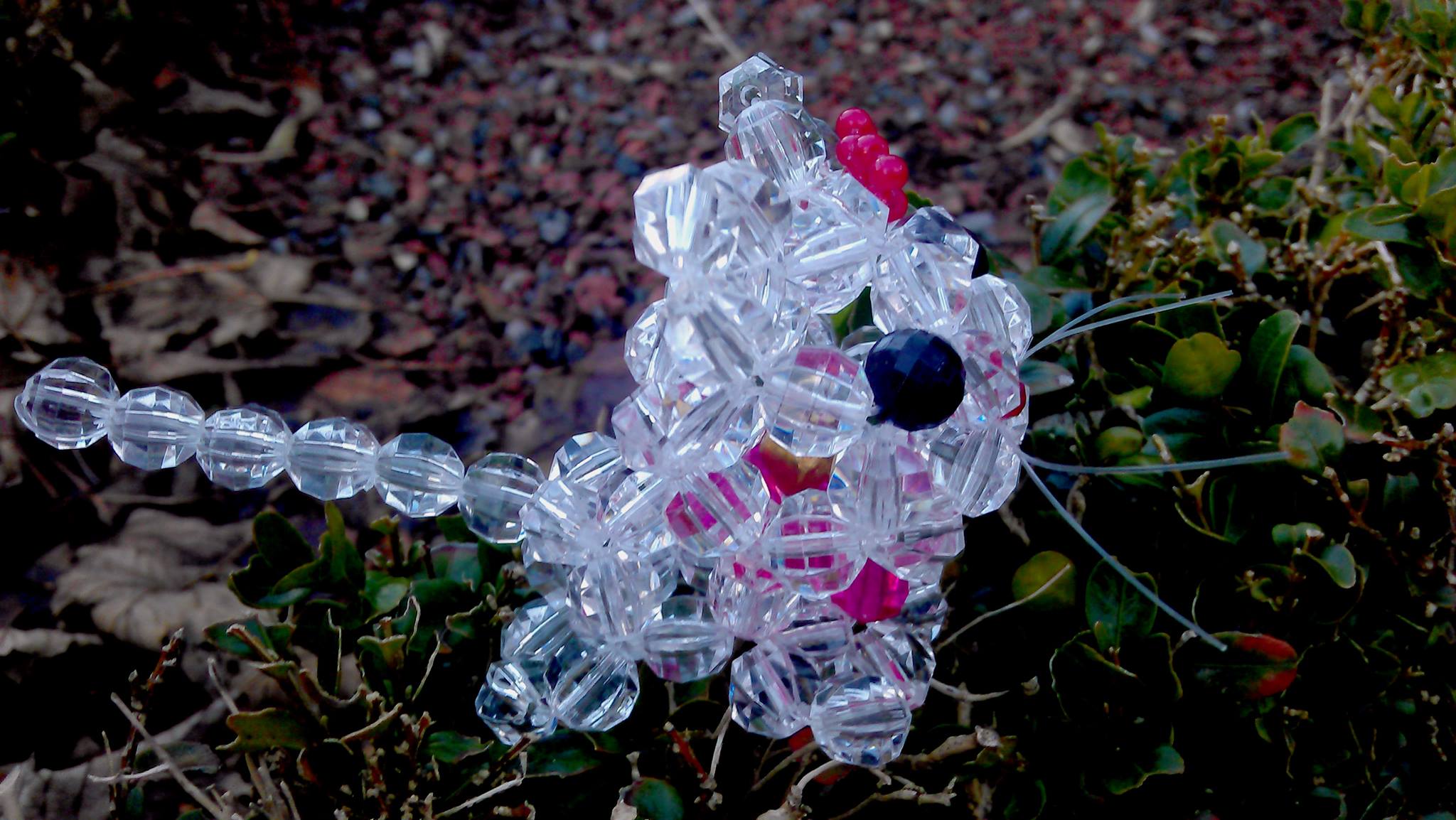 The cats are made using only artistic beads and copper wire. The beads are made from high quality hardened plastic, diamond shaped and cut to resemble a gem stone. They are multicolored (white, black, red and purple) yet semi transparent: you can see the wire going through the beads and even notice the small bell rotating inside the artwork. The white cat is a girl named Bell, and she is a true lady – she wears a collar and a bow around her right ear. Looking a bit like Hello Kitty, this lovely feline was photographed outside the Brecon Cathedral in Wales.