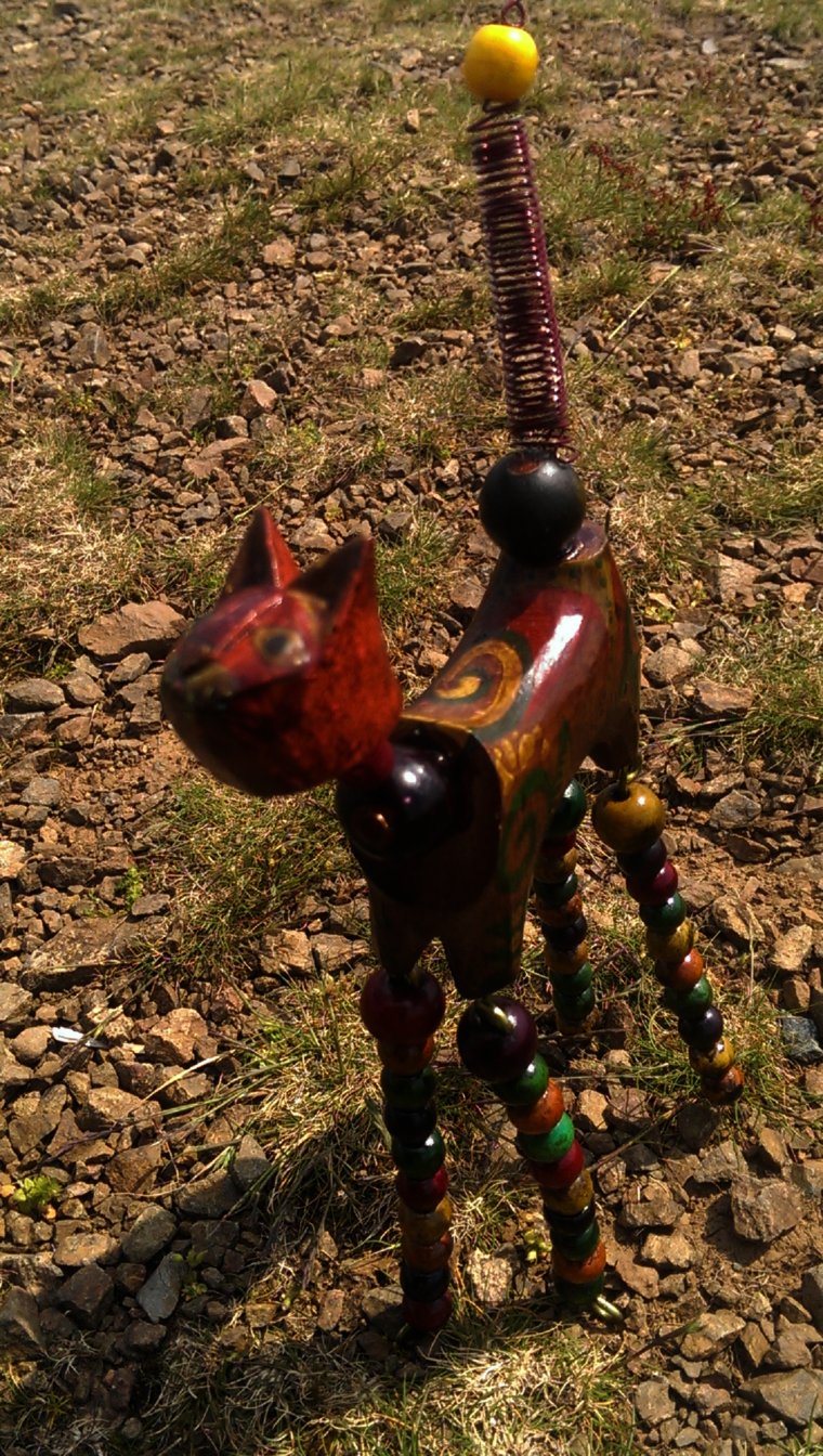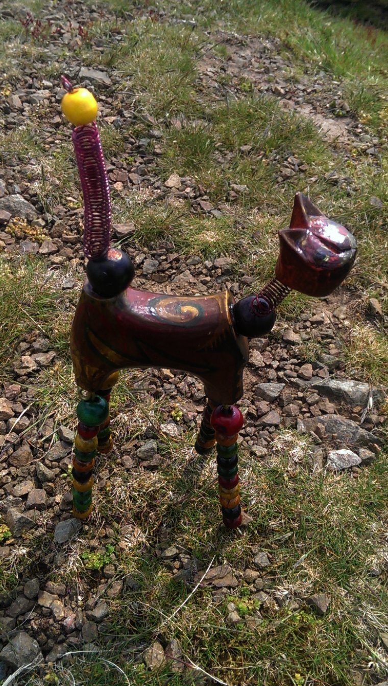 What can be made from several pieces of driftwood, two long springs, 43 wooden beads and four thin metal wires? The answer is simple: a very strange looking cat. Olympia’s collection is filled with unique creatures, but this feline is simply out of this world! This wooden figurine (or maybe a sculpture) is 20 cm tall (just body) and 29 cm in height if you count the tail. Hand carved driftwood has been polished, painted and covered with a nice amount of wood varnish giving the cat a nice smooth finish and lots of glow in the sunlight. It has been made in South East Asia and was brought to Europe by fair trade organization known as Leaf Gifts. Their headquarters is based in Nottingham (United Kingdom) but the Leaf Gifts import their stock to other fair trade stores in Italy, France and Germany. Our figure has been purchased by a friend in Sorrento in Italy during his spring holidays.