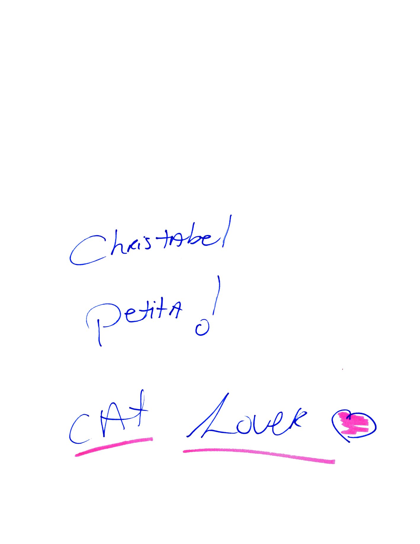 Seeing his sister Emma having a blast, Ernesto couldn’t help himself so he grabbed a pen and left a mark of his own! This is the first cat drawing in our guestbook that actually portraits a pair of cats instead of a single kitten. Ernesto drew a momma cat with a baby on a leisurely walk and added four paw prints, one more than his sister. He also signed the picture with his full name: Ernesto Griggio Eduard Salucem. Wow.