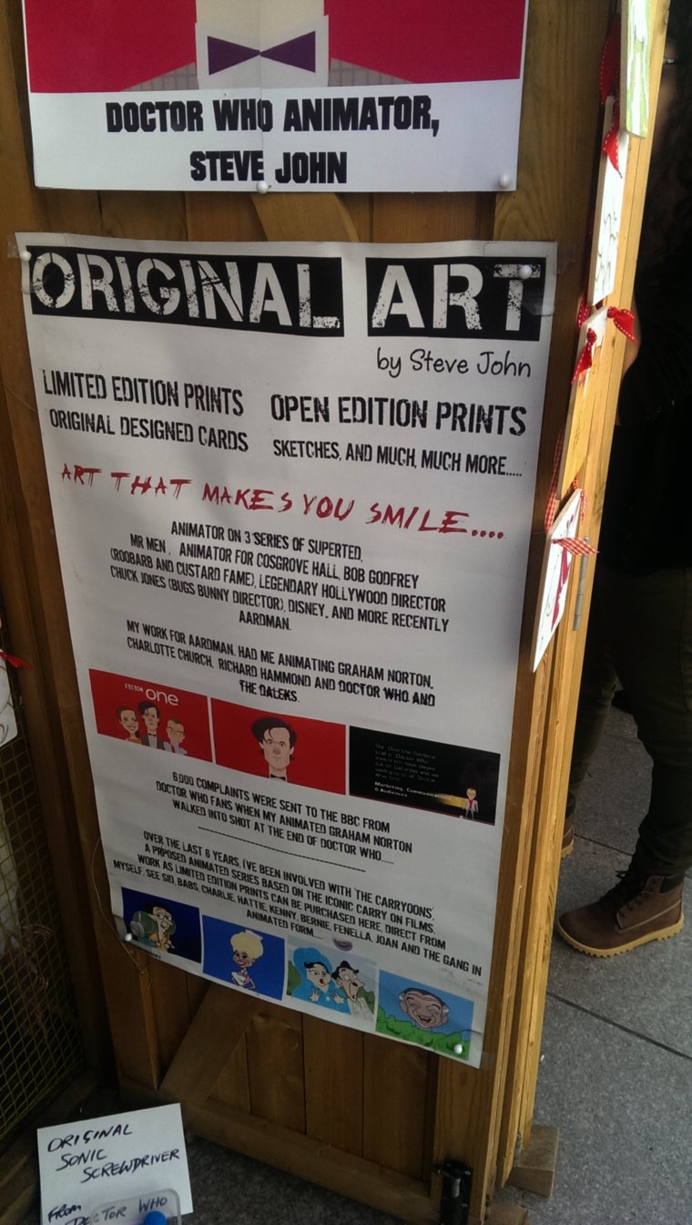 There is one last thing to be added. After leaving St David’s Hall, we noticed a row of small wooden sheds standing some 50 meters away from the entrance. The sheds have been previously locked as the entire street was closed off for pedestrian traffic. Once the premiere was over, the street was re-opened and sheds were now accessible for tourists. We were told that they belong to Craft Folk (fair crafts organizers in South Wales) and allow local artist to display their works in popular places around the city. What a great idea to promote Welsh makers that came from the Council itself! You know we are always interested in art markets and we decided to take a quick look. To our surprise, we found an artist displaying Doctor Who drawings and an original sonic screwdriver! The artist name is Steve John and he is a well known Cardiff based cartoonist, painter and animator. He specializes in super cute cartoon animal artworks, but can create animated wonders in Flash. His work has been featured on numerous times on TV, printed media and on the Internet (Doctor Who animations for BBC1). Steve is a graduate of Farnham College of Art and Design and has a diploma in Animation and Graphic design. He has been professionally working as an artist for nearly 30 years.